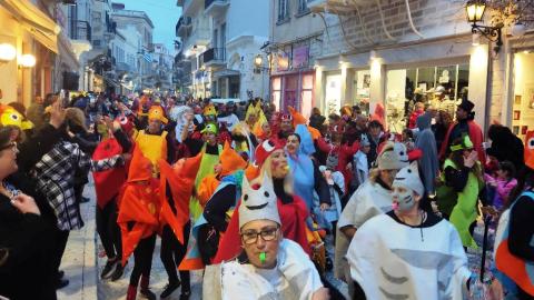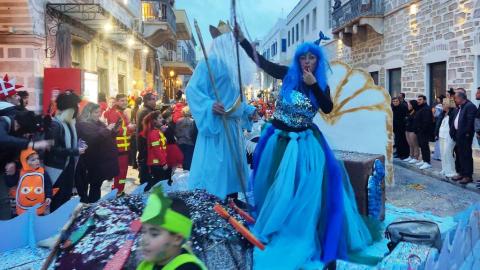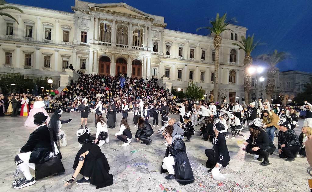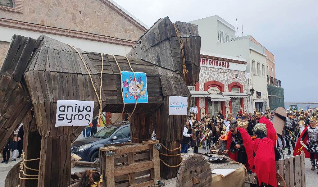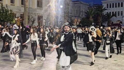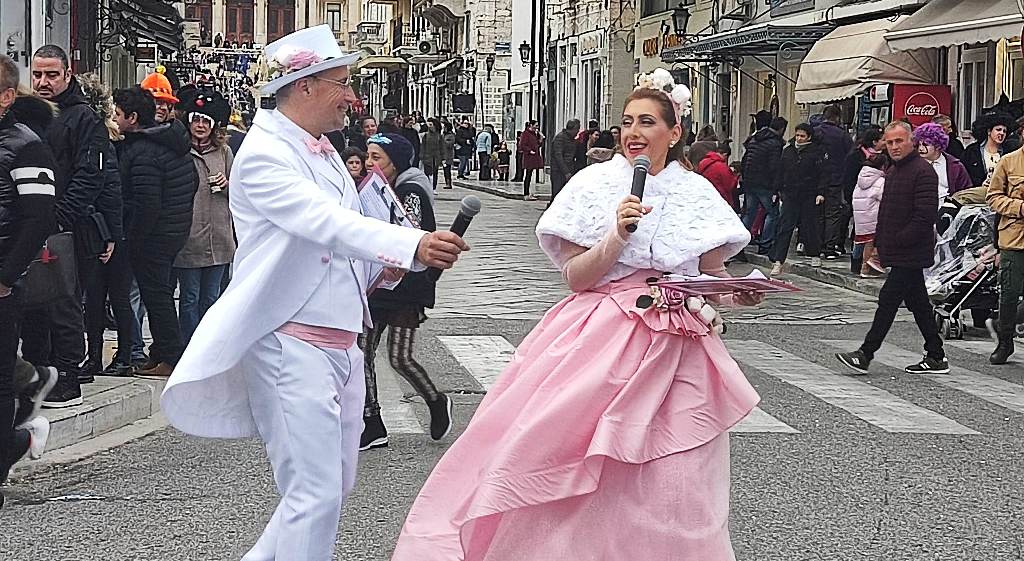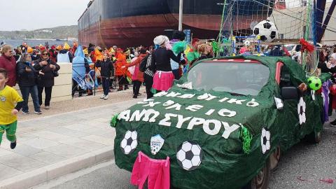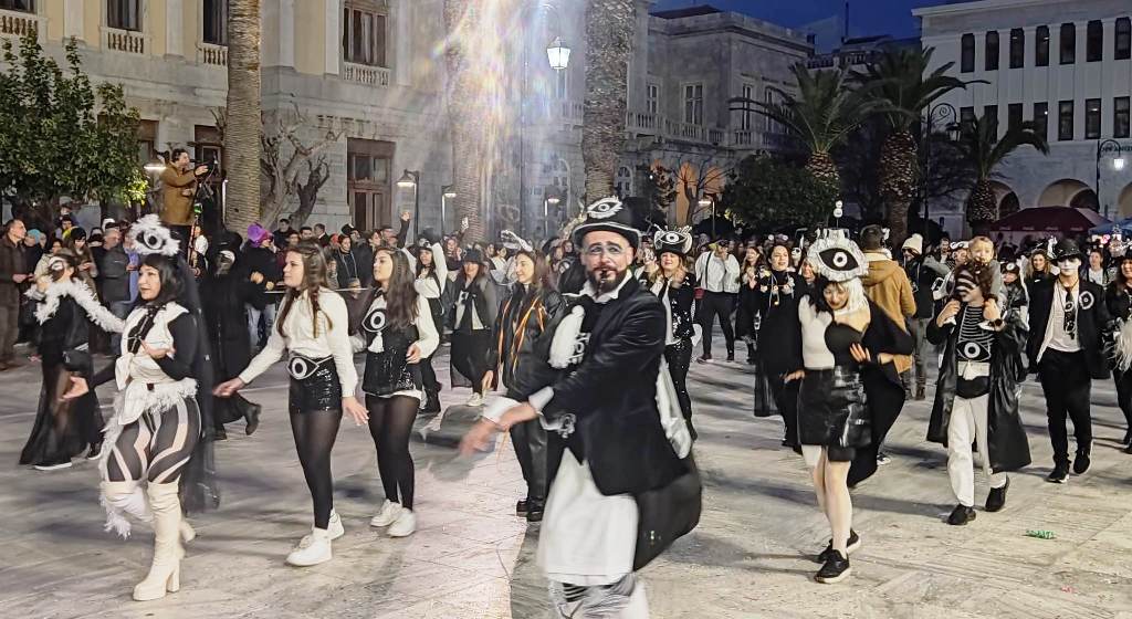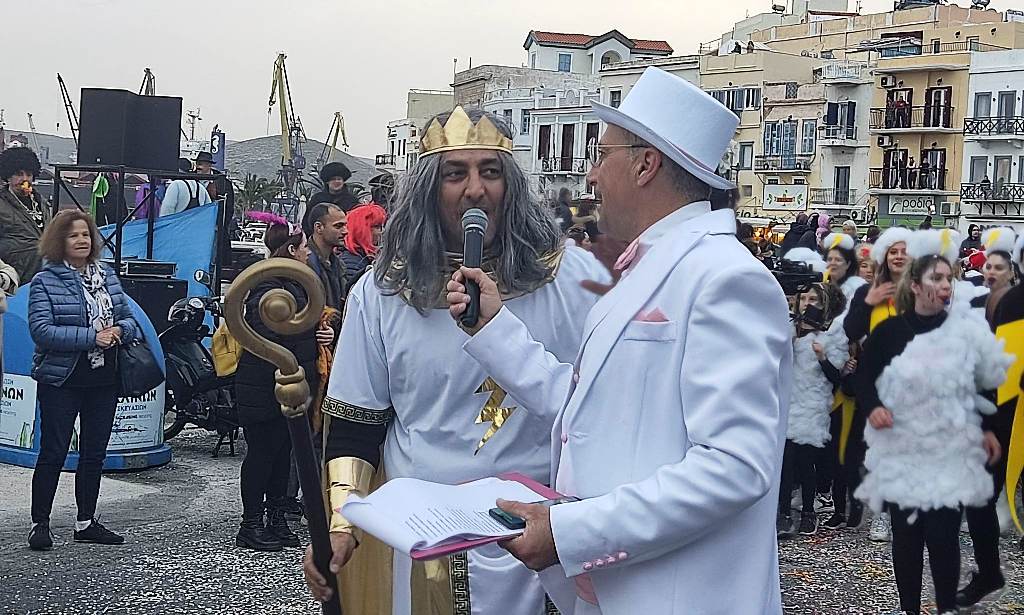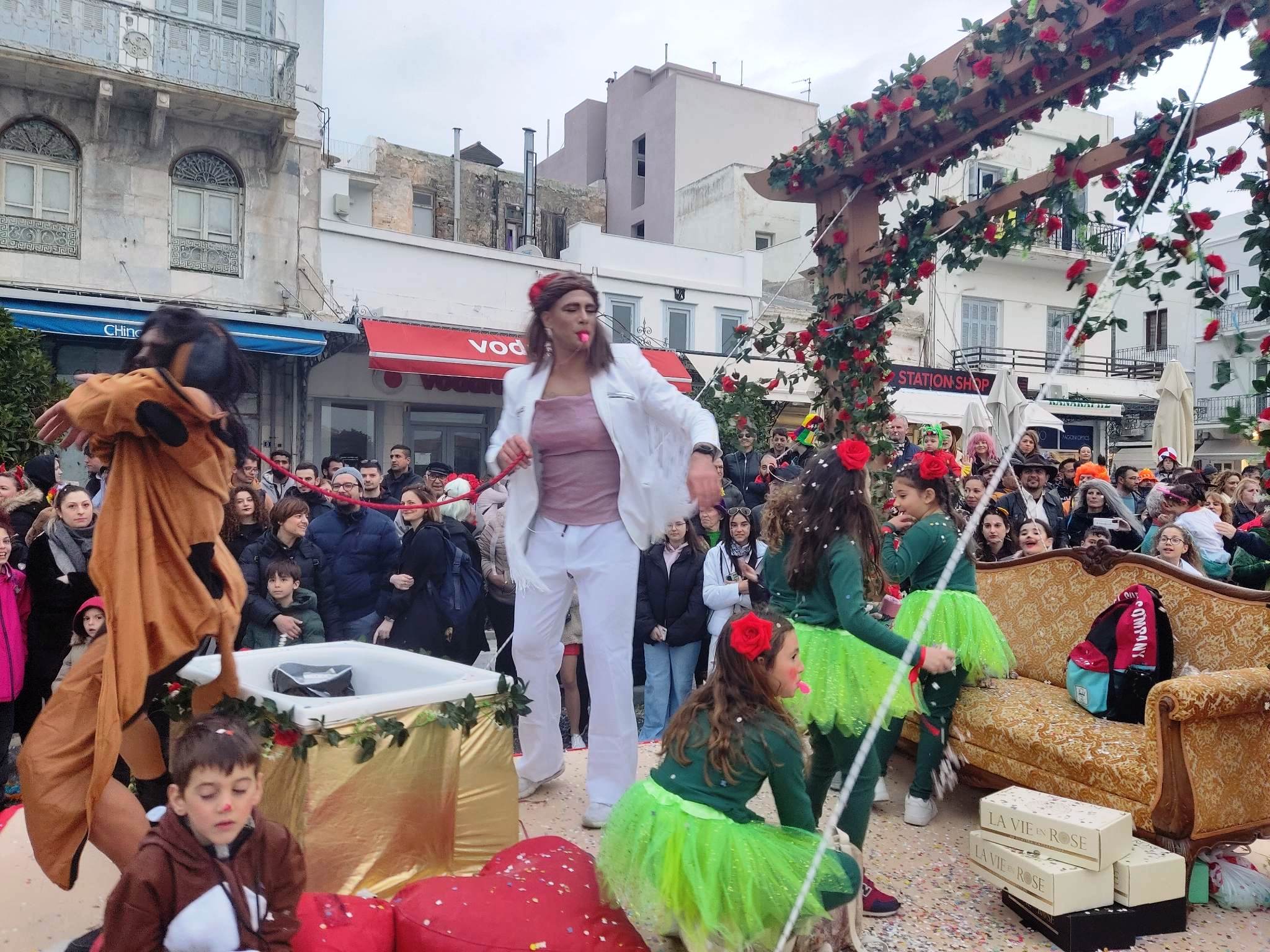 Τελευταία Κυριακή της Αποκριάς και η καρναβαλική παρέλαση στην Ερμούπολη βρίσκεται σε εξέλιξη, με πλήθος κόσμου να έχει πλημμυρίσει το κέντρο της πόλης, δίνοντας μία νότα χαράς και αισιοδοξίας.