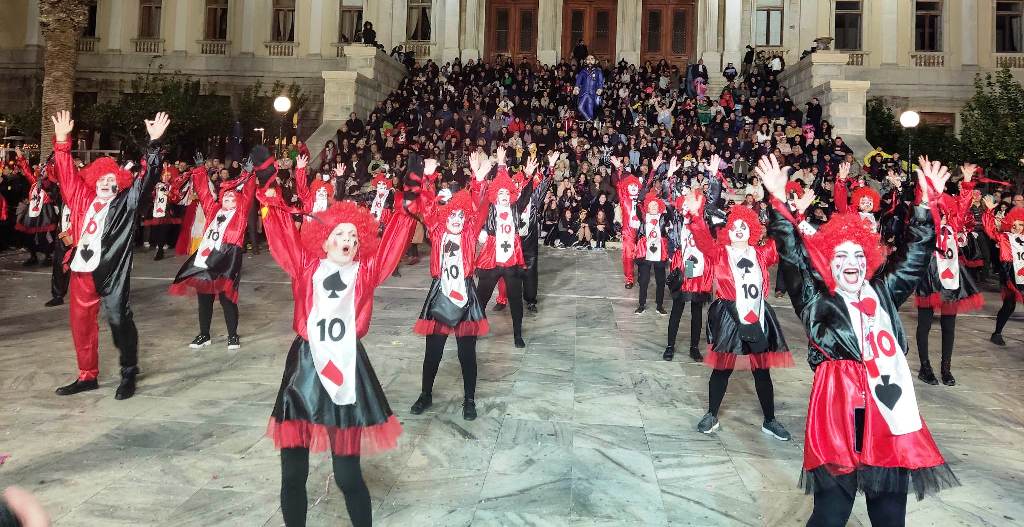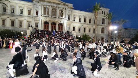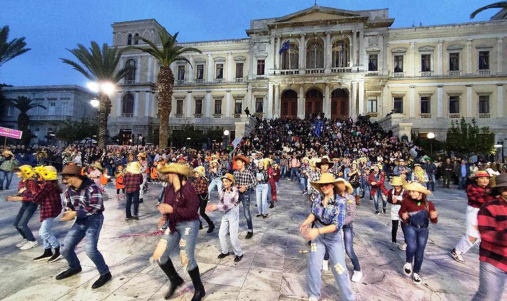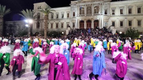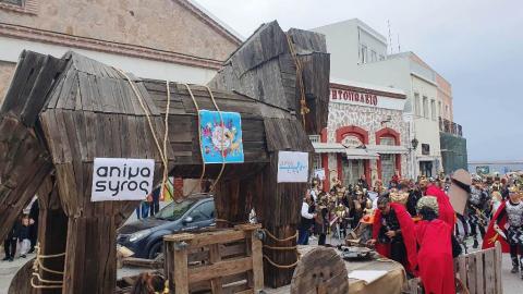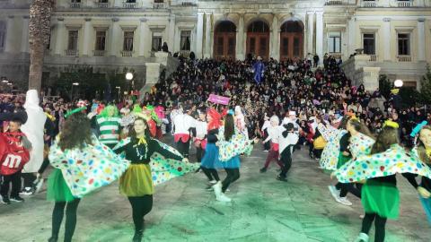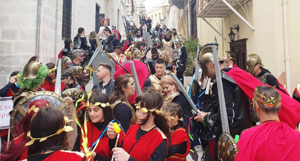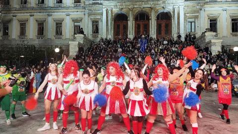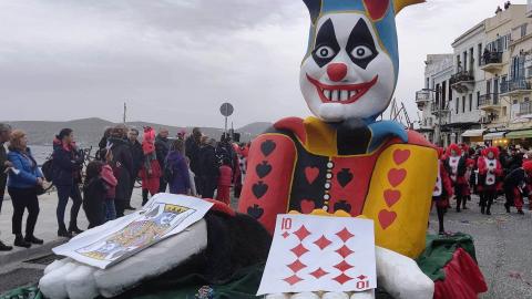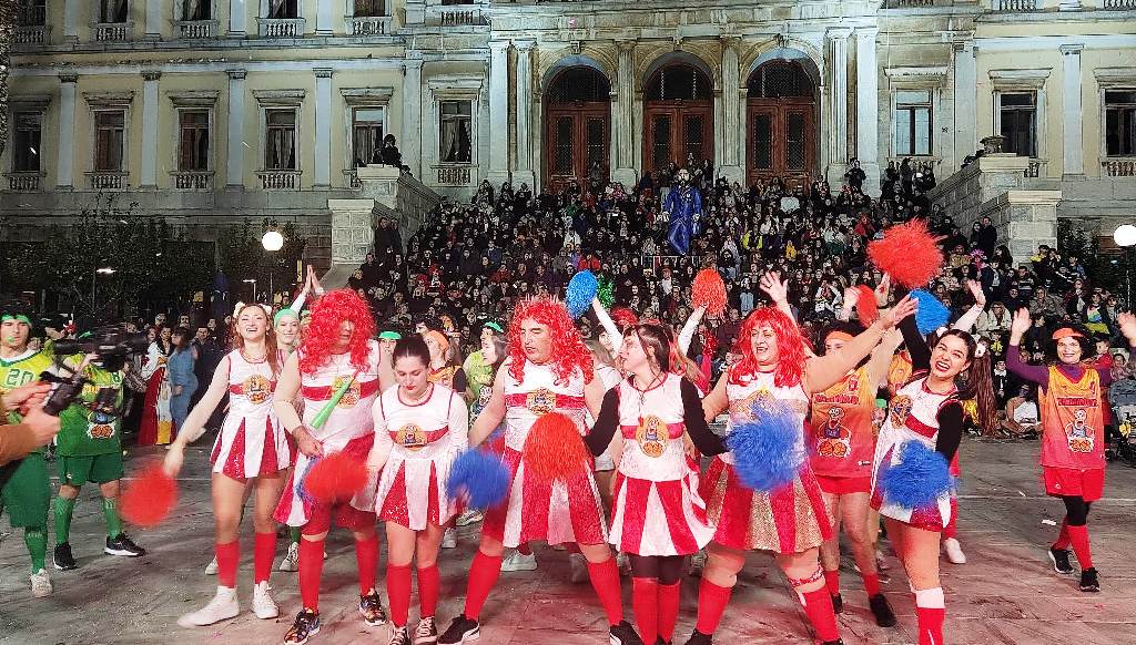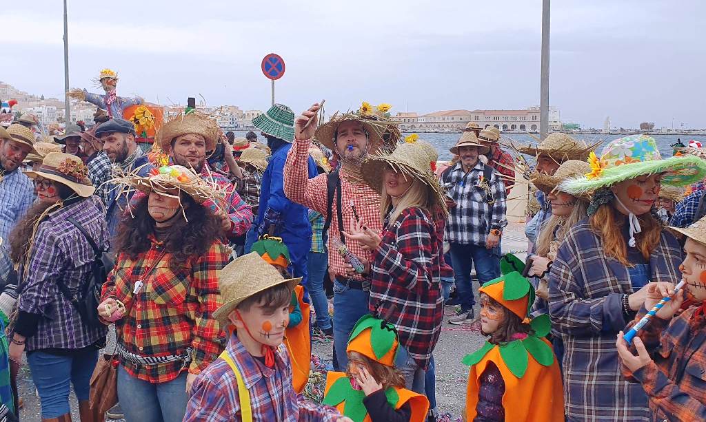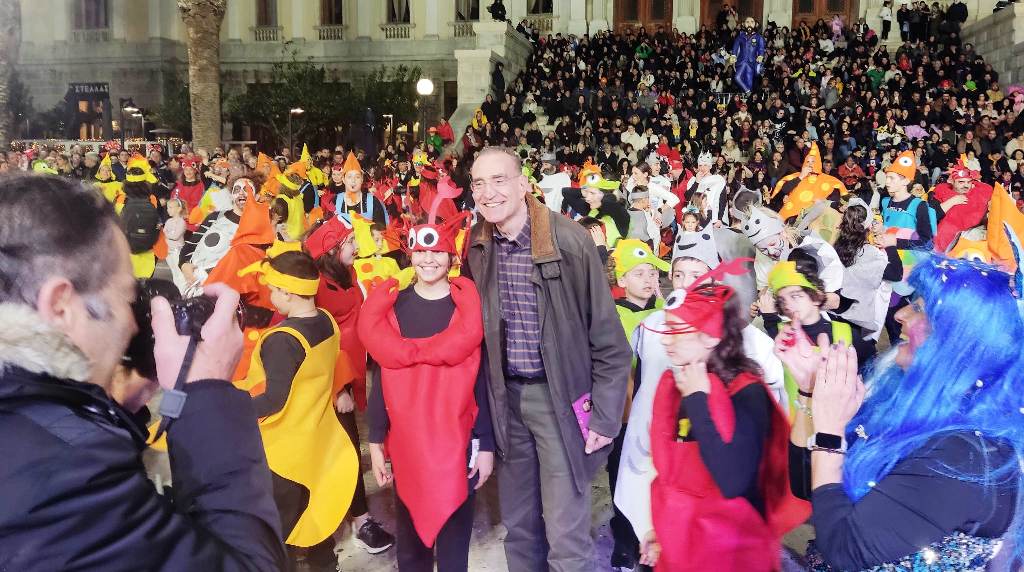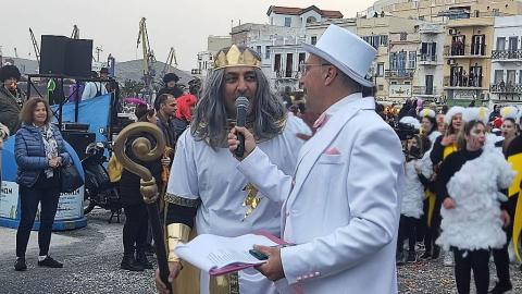 Τελευταία Κυριακή της Αποκριάς και η καρναβαλική παρέλαση στην Ερμούπολη βρίσκεται σε εξέλιξη, με πλήθος κόσμου να έχει πλημμυρίσει το κέντρο της πόλης, δίνοντας μία νότα χαράς και αισιοδοξίας.