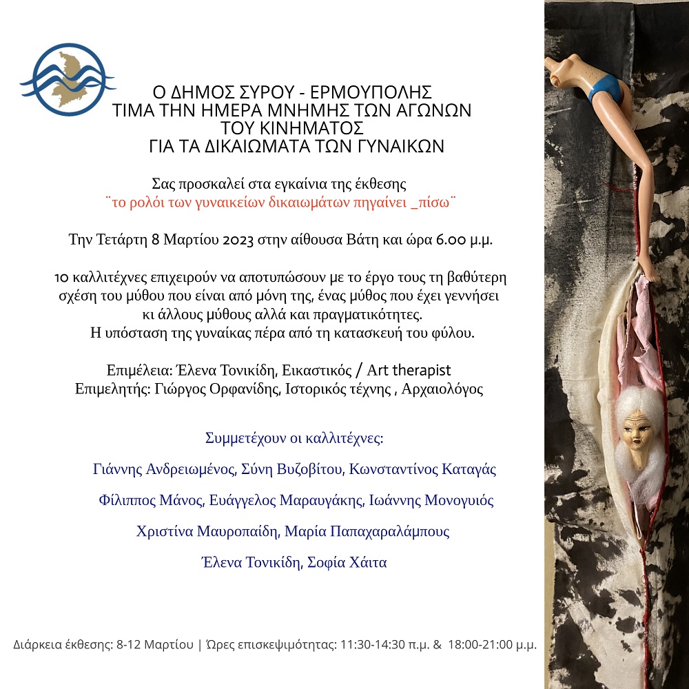Εγκαινιάζεται σήμερα το απόγευμα στις 18.00, στην Αίθουσα Γ&Ε Βάτη, η έκθεση “Το ρολόι των γυναικείων δικαιωμάτων πηγαίνει πίσω” με τη συμμετοχή σημαντικών καλλιτεχνών. Όπως κάθε χρόνο, έτσι και φέτος, ο Δήμος Σύρου – Ερμούπολης, με αφορμή την «Παγκόσμια Ημέρα της Γυναίκας», προγραμματίζει μια δράση που στοχεύει στην ανάδειξη της διαφορετικής θέασης/ανάγνωσης των δικαιωμάτων της γυναίκας στη σύγχρονη εποχή.