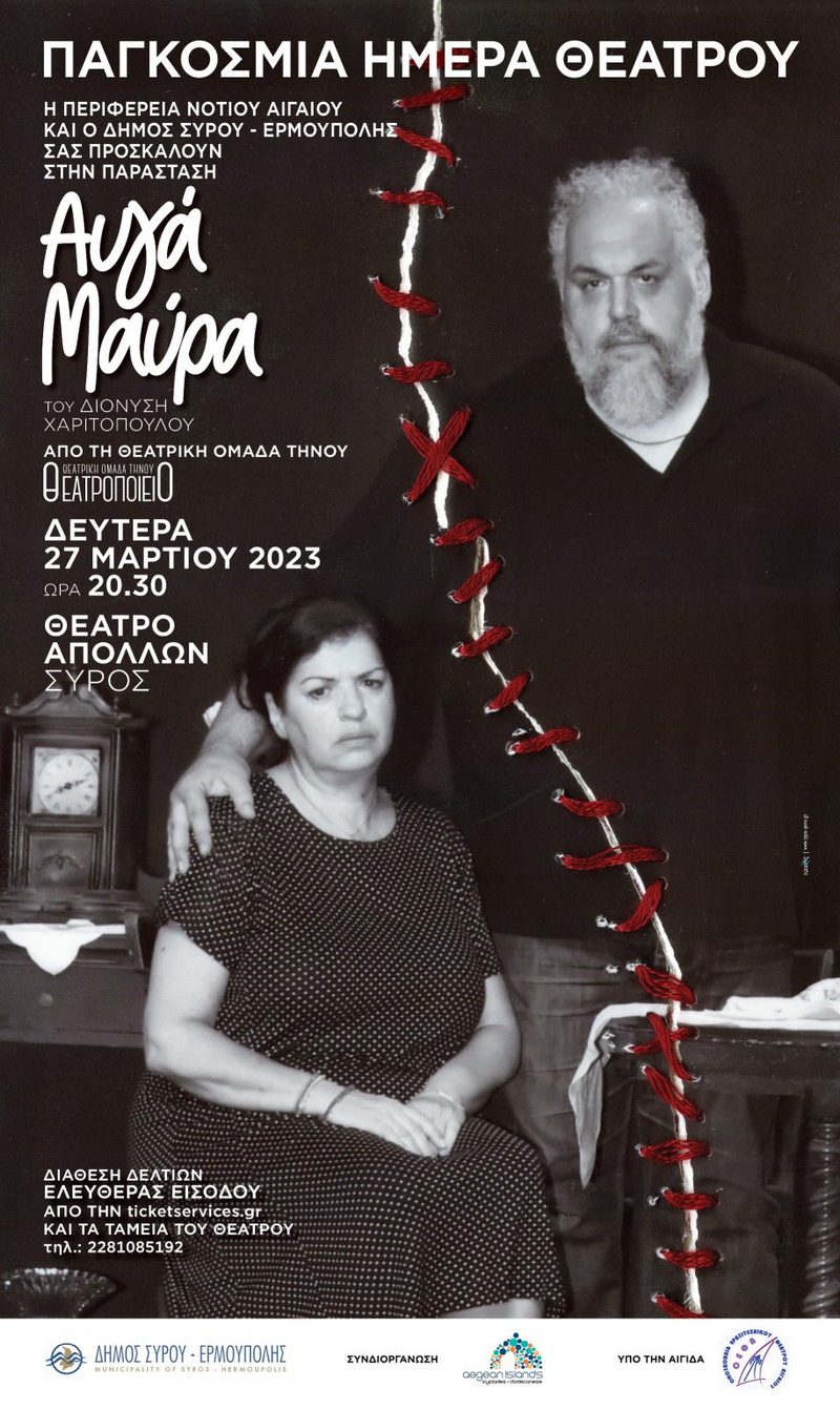 Στο πλαίσιο του Εορτασμού της Παγκόσμιας Ημέρας Θεάτρου, ο Δήμος Σύρου- Ερμούπολης σε συνδιοργάνωση με την Περιφέρεια Νοτίου Αιγαίου παρουσιάζουν τη θεατρική παράσταση “Αυγά Μαύρα”, ένα έργο του Διονύση Χαριτόπουλου, από τη Θεατρική Ομάδα Τήνου “Θεατροποιείο”, σήμερα Δευτέρα 27 Μαρτίου στο Ιστορικό Θέατρο Απόλλων.