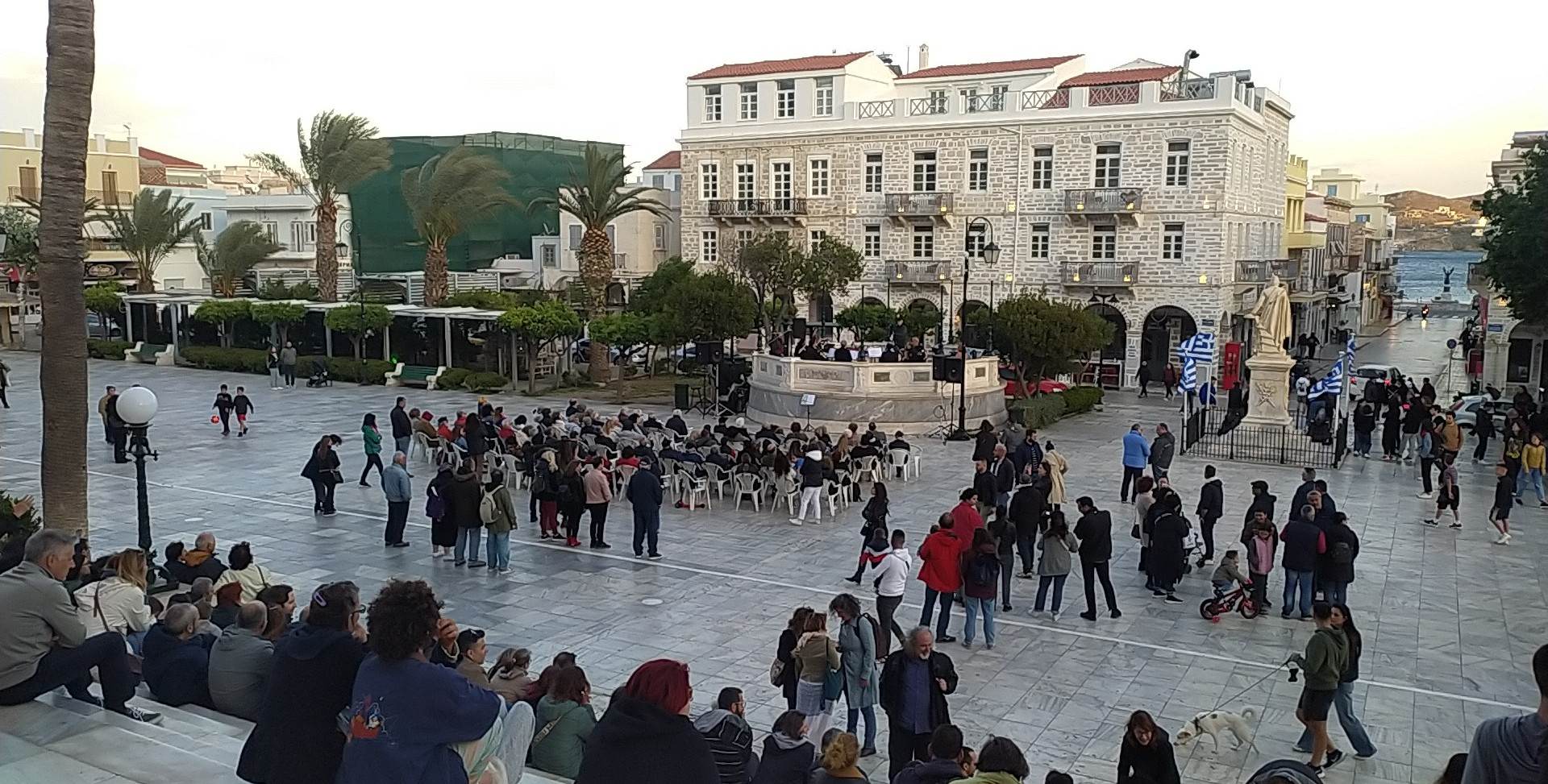Η συναυλία άρχισε λίγο μετά τις 19.00 και διήρκησε λίγο περισσότερο από μία ώρα. Οι πρώτοι που κατέφθασαν, καθώς και οι μεγαλύτεροι σε ηλικία, παρακολούθησαν τη συναυλία από τις πλαστικές καρέκλες που είχαν τοποθετηθεί μπροστά από την εξέδρα, ενώ αρκετός κόσμος, ανάμεσά τους και πολλά παιδιά, απόλαυσαν τη μουσική δράση από τα σκαλιά του Δημαρχείου. Ωστόσο, ο κόσμος που παρευρέθηκε, ήταν αρκετά λιγότερος από τον αναμενόμενο, δεδομένου ότι αντίστοιχη δράση είχε πολλά χρόνια να πραγματοποιηθεί στη Σύρο, με την, μοναδικής ομορφιάς και ακουστικής, εξέδρα να μένει ανεκμετάλλευτη επί δεκαετίες.