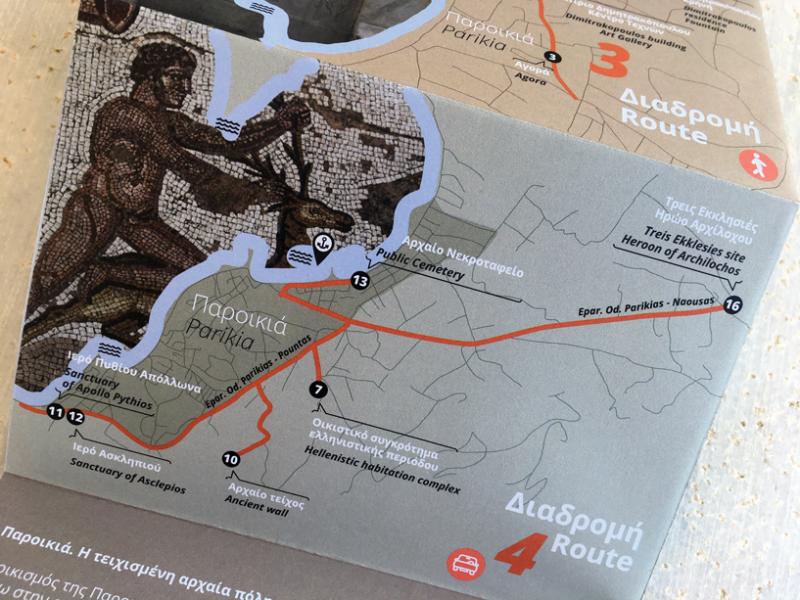 Η πρώτη Πολιτιστική Διαδρομή περιλαμβάνει το Ιερό Δηλίου Απόλλωνα και Άρτεμης, το Αψιδωτό οικοδόμημα (Περιοχή  Κριός), το επίσημο νεκροταφείο (Θέση  Βίτζι), το Ηρώον Αρχίλοχου-Τρεις Εκκλησιές (Περιοχή Έλητας) και τα Αρχαία λατομεία (Θέσεις Μαράθι και Λάκκοι). Η δεύτερη  Πολιτιστική Διαδρομή περιλαμβάνει την Παναγία Eκατoνταπυλιανή, το Αρχαιολογικό Μουσείο, το Υπαίθριο Ιερό – Θεσμοφόριο, το Οικιστικό συγκρότημα ελληνιστικής περιόδου (Θέση Καστροβούνι), το Αρχαίο τείχος (Θέση Δύο Πλάκες) και το Εργαστήριο κεραμικής (Θέση Θόλος).