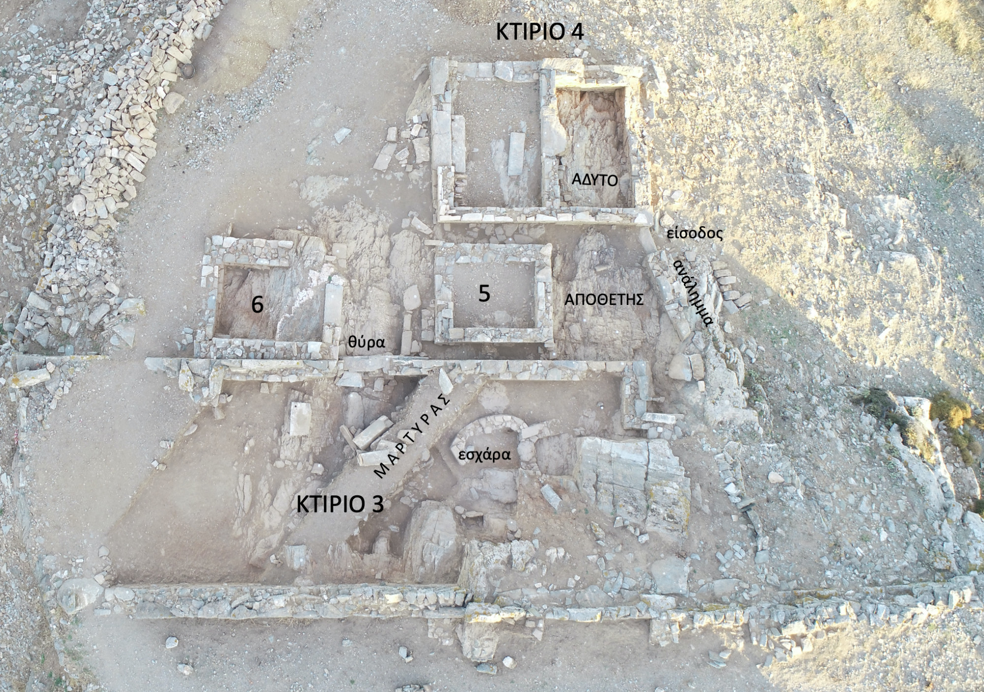 Ανάμεσα στο ναό αυτό και το επίμηκες "Κτήριο 3" νοτιότερα, παρεμβάλλονται δύο σχεδόν τετράγωνα μικρά οικοδομήματα (αρ. 5 και 6) με αντικρυστές εισόδους. Κατά την τελευταία περίοδο ολοκληρώθηκε η έρευνα του Δυτικού "Κτηρίου 6" (διαστ. 4,85 Χ 4,25 μ.). Το εσωτερικό του διαμορφώνεται εσωτερικά σε τουλάχιστον τρία επίπεδα. Φαίνεται ότι εδώ βρισκόταν αρχικά η κύρια βαθμιδωτή πρόσβαση στο τέμενος, η οποία καταργήθηκε κατά τους ρωμαϊκούς χρόνους και ενσωματώθηκε στο "Κτήριο 6", πιθανώς για την εξυπηρέτηση λατρευτικών αναγκών (ίσως ως μια προσομοίωση της καθόδου στον Άδη;).