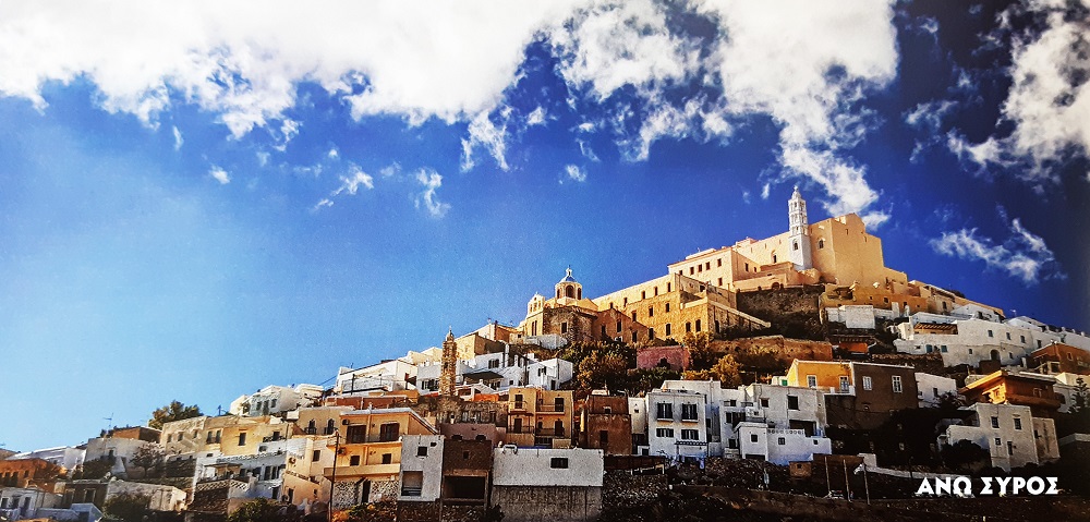 Άνω Σύρος: Η πρώτη πόλη. Μια πανέμορφη γραφική, μεσαιωνική πολιτεία είναι απλωμένη στον κεντρικό και υψηλότερο λόφο του νησιού που στεφανώνεται από την εκκλησία του Αγίου Γεωργίου, San Giorgio, όπως λένε οι ντόπιοι την Μητρόπολη των Καθολικών. Είναι μια πόλη χωρίς θορύβους και καυσαέρια, αφού οι δρόμοι και τα στενά της εξυπηρετούν μόνο τους ανθρώπους και όχι τ’ αυτοκίνητα. Το κάθε σπίτι και η κάθε εκκλησία ή μοναστήρι είναι ένα μνημείο 700 χρόνων. Το 1822 ήταν η αρχή μιας νέας πόλης, της Ερμούπολης, της πρωτεύουσας.”Αυτό έγινε εδώ πριν ένα αιώνα, δεν έγινε πουθενά αλλού. Στη Σύρο ξαναγεννήθηκε η Ελλάδα”. Είπε κάποτε ο Ελευθέριος Βενιζέλος. Εδώ, στο βραχονήσι των 85 τετραγωνικών χιλιομέτρων γεννήθηκε και άνθισε ένας πολιτισμός, όμοιος με τον πολιτισμό των μεγάλων Ευρωπαϊκών πόλεων. Αρχές του 19ου αιώνα, μια νέα πόλη γεννιέται. Μια πόλη που είχε μια πολυσήμαντη παρουσία στο Αιγαίο και ήταν ένα από τα κυριότερα πνευματικά κέντρα της Ελλάδος. Η Ερμούπολη, η πρωτεύουσα των Κυκλάδων, η πόλη του Κερδώου, αλλά και του Λόγιου Ερμή, γεννήθηκε και δημιουργήθηκε μέσα στις φλόγες της Επανάστασης του 1821 από πρόσφυγες. Ήταν το 1822 όταν έγινε η μεγάλη σφαγή της Χίου (υπάρχει πίνακας του Ευγενίου Ντελακρουά. Μουσείο Λούβρου). Ακολούθησε η καταστροφή των Ψαρών, της Κάσσου, της Ιωνίας... Το Αιγαίο δονήθηκε από κραυγές ξεριζωμένων ανθρώπων. Αυλακωνόταν από πλοία με πρόσφυγες που αναζητούσαν μια νέα πατρίδα. Και τότε, ανακαλύφθηκε το καλλίτερο καταφύγιο. Η Σύρος! Ήταν ιδανικός τόπος. Το νησί δεν το άγγιξε ποτέ πόλεμος. Ήταν ελεύθερο. Σ’ αυτό το νησί έγινε η πρώτη ειρηνική και δημιουργική επανάσταση που οδήγησε την Ερμούπολη στην οικονομική ακμή, στην κοινωνική εξέλιξη και στην πολιτιστική άνθηση. Όμως η Σύρος δεν είναι μόνο οι δύο πόλεις της. Δεν είναι μόνο η Ερμούπολη και η μικρή μεσαιωνική πόλη της Άνω Σύρου σκαρφαλωμένη στο λόφο. Σύρος είναι και οι εξοχές και τα χωριά απλωμένα στους ελάχιστους μικρούς κάμπους η σκορπισμένα στους λόφους.