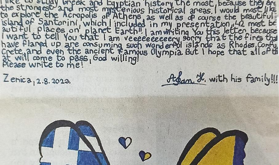 Περισσότερο από όλα θα ήθελα να εξερευνήσω την Ακρόπολη της Αθήνας, όπως επίσης και το νησί της Σαντορίνης, το οποίο συμπεριέλαβα στην παρουσίαση της εργασίας μου για τα... 42 πιο όμορφα μέρη στον πλανήτη Γη! Σας γράφω αυτή την επιστολή, επειδή θα ήθελα να σας πω ότι λυπάμαι πάάάρα πολύ που οι φωτιές που ξέσπασα κατέκαψαν τόσα όμορφα νησιά, όπως η Ρόδος, η Κέρκυρα και η Κρήτη... ή ακόμη διάσημη Αρχαία Ολυμπία. Όμως ελπίζω ότι όλο αυτό θα τελειώσει, Θεού θέλοντος.”