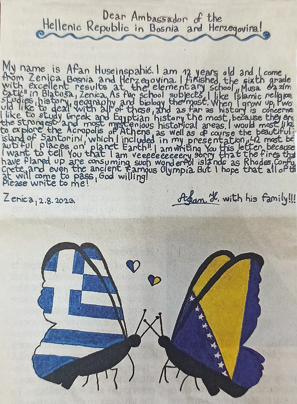 Με βαριά καρδιά, όπως είχε παρακολουθήσει στη τηλεόραση τα ελληνικά δάση να καίγονται, με ιδιαίτερη φροντίδα άνοιξε το φάκελο από το γράμμα που έλαβε και διάβασε το χειρόγραφο περιεχόμενο, που έγραφε: “Αγαπητέ πρέσβη της Ελληνικής Δημοκρατίας, στη Βοσνία και Ερζεγοβίνη, ονομάζομαι Αφάν Χουσεΐνσπαχιτς και κατάγομαι από τη Ζένιτσα (στη Βοσνία και Ερζεγοβίνη), και είμαι δώδεκα χρόνων”. Και συνέχιζε: “ολοκλήρωσα με άριστα την έκτη δημοτικού στο δημοτικό σχολείο “Μούσα Τ. Κάτιτς” στην Μπλατούσα της Ζένιτσα. Στο σχολείο μου αρέσουν περισσότερο τα μαθήματα ισλαμική θρησκείας, η ιστορία, η γεωγραφία και η βιολογία. Όταν μεγαλώσω θα ήθελα να ασχοληθώ με όλα αυτά και... σε ότι αφορά την ιστορία σκέφτομαι να μελετήσω κυρίως την ελληνική και αιγυπτιακή ιστορία, που αποτελούν τις πιο δυνατές και μυστηριώδεις ιστορικές περιοχές.