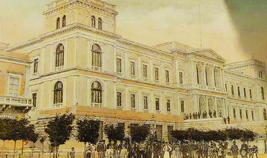 Οι ενέργειες για την οικοδομή Δημαρχείου χρονολογούνται από πολύ παλιά. Στο πολεοδομικό σχέδιο είχαν προβλέψει για τη θέση του κτιρίου, αργότερα, στα 1854 ο τότε διευθυντής του Μηχανικού Κυκλάδων Αλ. Γεωργαντάς έκανε τα πρώτα σχέδια. Λίγο αργότερα, όμως, ο Δήμος αγόρασε το κατάλληλο οικόπεδο στην κεντρική Πλατεία. Στα 1869 τα σχέδια αυτά χάθηκαν, γιατί είχαν μεταφερθεί στη Γαλλία για να το κρίνουν οι Γάλλοι αρχιτέκτονες και μηχανικοί. Χρειάστηκε να περάσουν μερικά χρόνια, ώστε να πραγματοποιηθεί η επιθυμία του Δήμου. Τότε στα 1875 έκαναν τις σχετικές ενέργειες για να ανεγερθούν τα “Αρχεία του Δήμου”στο δημοτικό οικόπεδο της κεντρικής πλατείας, δίπλα στη Λέσχη, με σχέδια του Γερμανού αρχιτέκτονα Ερνέστου Τσίλλερ. Τα σχέδια χρονολογούνται από το 1871. Μία επταμελής επιτροπή ανέλαβε να κάνει τη δημοπρασία και ο προϋπολογισμός της δαπάνης έφτασε τις 600.000 δρχ. Ο Ε. Τσίλλερ έκανε μια άριστη εργασία!! Η θεμελίωση έγινε με μεγάλη επισημότητα στις 11 Ιανουαρίου 1876 από το Μητροπολίτη Ξάνθης Διονύσιο. Οι διοικητικές και στρατιωτικές αρχές, ο δήμαρχος και πολύς κόσμος τίμησαν την τελετή με την παρουσία τους. Στην πλάκα, που τοποθέτησαν στα θεμέλια ήταν χαραγμένη η επιγραφή: “ Εν έτει σωτηρίω, μηνί Ιανουαρίω, Γεωργίου του Α΄Βασιλεύοντας, Σκαρλάτου Ρωσσέτου νομαρχούντος, Δημητρίου Βαφιαδάκη Δημαρχούντος, ο Δήμος Ερμουπόλεως τήνδε την οικοδομήν... των του Δήμου Αργείων ανήγειρε”. Οι εργασίες εκδηλώθηκαν έντονα ώστε να ολοκληρωθεί το μεγαλοπρεπές κτίριο, παρά το γεγονός ότι όλη αυτή η πολυτέλεια του θαυμάσιου μεγάλου δημαρχείου εκείνη την εποχή είναι δυσανάλογος και ανάρμοστη προς όλη την κατάσταση και τις ανάγκες της πόλης. Έτσι είχαν αναφέρει το1876. Το κτήριο ολοκληρώθηκε στα τέλη του 19ου αιώνα με έξοδα του Δήμου. Στα 1891 μετέφεραν, οι ειδικοί, εκεί το Δημαρχείο και νοίκιασαν ορισμένες αίθουσες για Πρωτοδικείο και Εφετείο, ενώ όλο το επόμενο διάστημα, συνέχιζαν τις εργασίες στο εσωτερικό. Το ιδιαίτερα συγκινητικό είναι ότι το τέλος της οικοδομής αυτού του θαυμάσιου Δημαρχείου συμπίπτει με το θάνατο του Δημάρχου Δ. Βαφιαδάκη. Πέθανε στις 8 Μαΐου 1898. Που στην επιμονή και στο ζήλο του οφείλεται η θεμελίωση και η ολοκλήρωση του Δημαρχείου. Στην πρόσοψη του κτιρίου είχε χαραχθεί η επιγραφή: “Ερμού Δήμος ταδ’ είσατο δημαρχούντος Δημητρίου Βαφιαδάκη”.