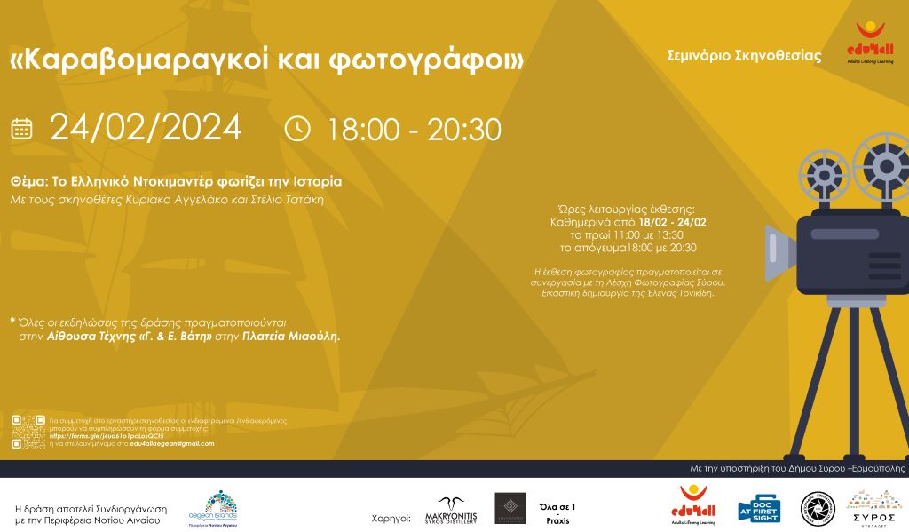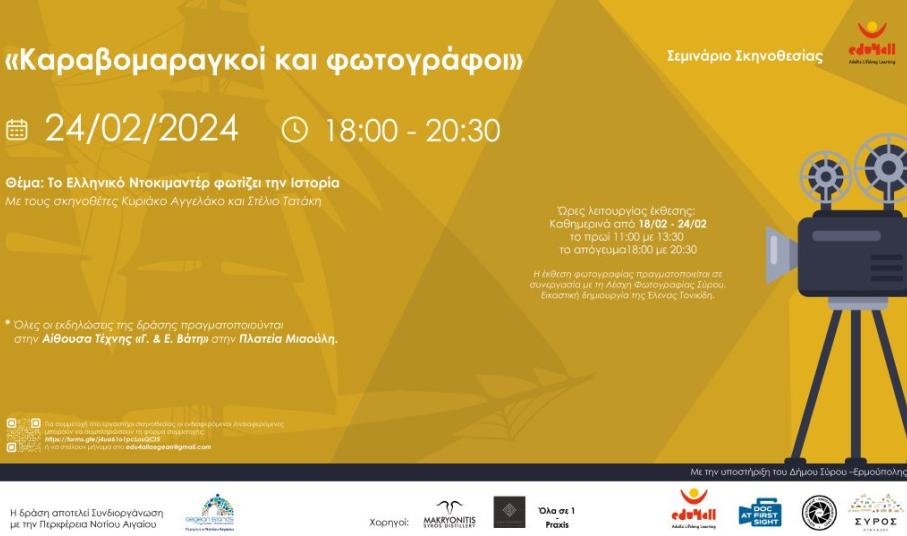Η “Edu4all – Εκπαίδευση για όλους” σας προσκαλεί σε σεμινάριο σκηνοθεσίας με θέμα «Το Ελληνικό Ντοκιμαντέρ φωτίζει την Ιστορία» με τους σκηνοθέτες Κυριάκο Αγγελάκο και Στέλιο Τατάκη.