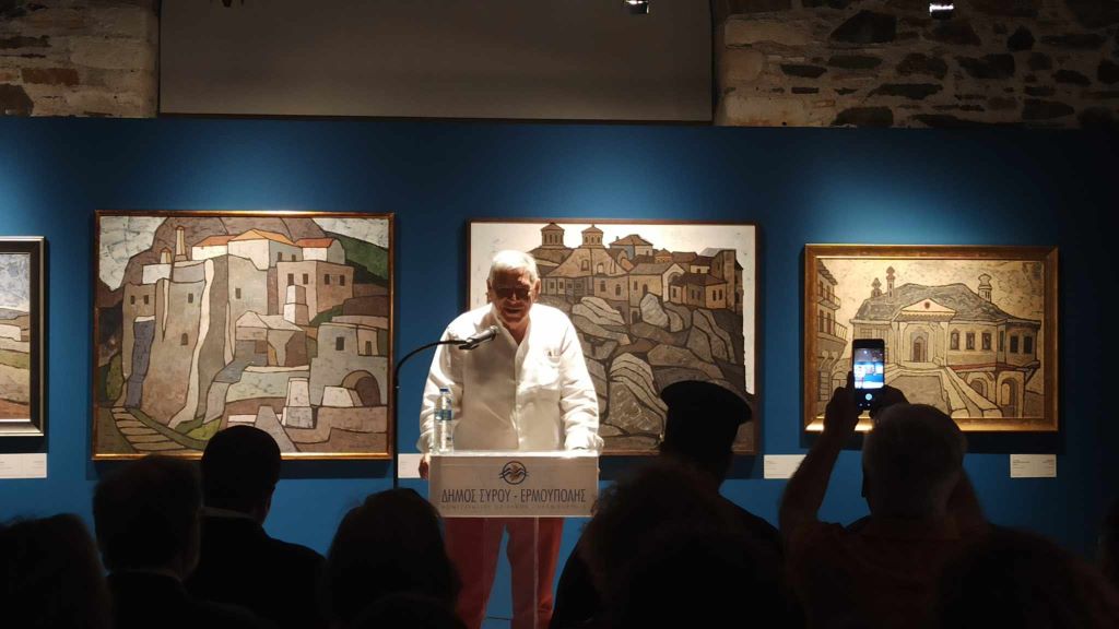 Επίσης, χαιρετισμό απεύθυνε και ο δήμαρχος Σύρου-Ερμούπολης, Αλέξης Αθανασίου, ο οποίος εκτός από την μοναδική καλλιτεχνική αξία της συγκεκριμένης έκθεσης του Γιώργου Σικελιώτη, εξέφρασε τις ιδιαίτερες ευχαριστίες του προς το Ίδρυμα Αντώνιος Ε. Κομνηνός, αλλά και προς το πρόσωπο του επίτιμου δημότη του Δήμου, κ. Κομνηνού, ο οποίος, όπως τόνισε, στηρίζει διαχρονικά τις τέχνες και τον πολιτισμό της Σύρου, μέσα από υψηλής αισθητικής και ποιότητας καλλιτεχνικές πρωτοβουλίες, αλλά και μέσω επιχορηγήσεων για τη συντήρηση του χώρου της Πινακοθήκης.