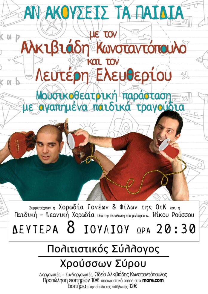 "Αν ακούσεις τα παιδιά" είναι το θέμα της παιδικής μουσικής συναυλίας που θα παρουσιάσουν στη Σύρο ο Λευτέρης Ελευθερίου και ον Αλκιβιάδης Κωνσταντόπουλος.