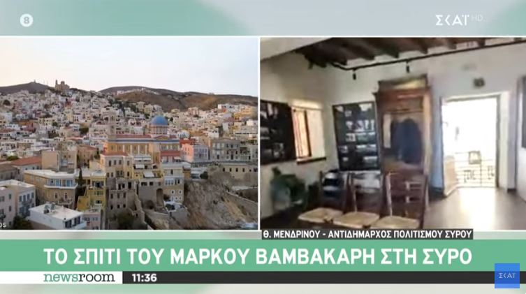 Στην εκπομπή Newsroom της τηλεόρασης του ΣΚΑΪ εμφανίστηκε σε ζωντανή σύνδεση χθες, Δευτέρα 19 Αυγούστου, η αντιδήμαρχος Πολιτισμού του Δήμου Σύρου-Ερμούπολης, Θωμαή Μενδρινού, με αφορμή την έκθεση του Μάρκου Βαμβακάρη.