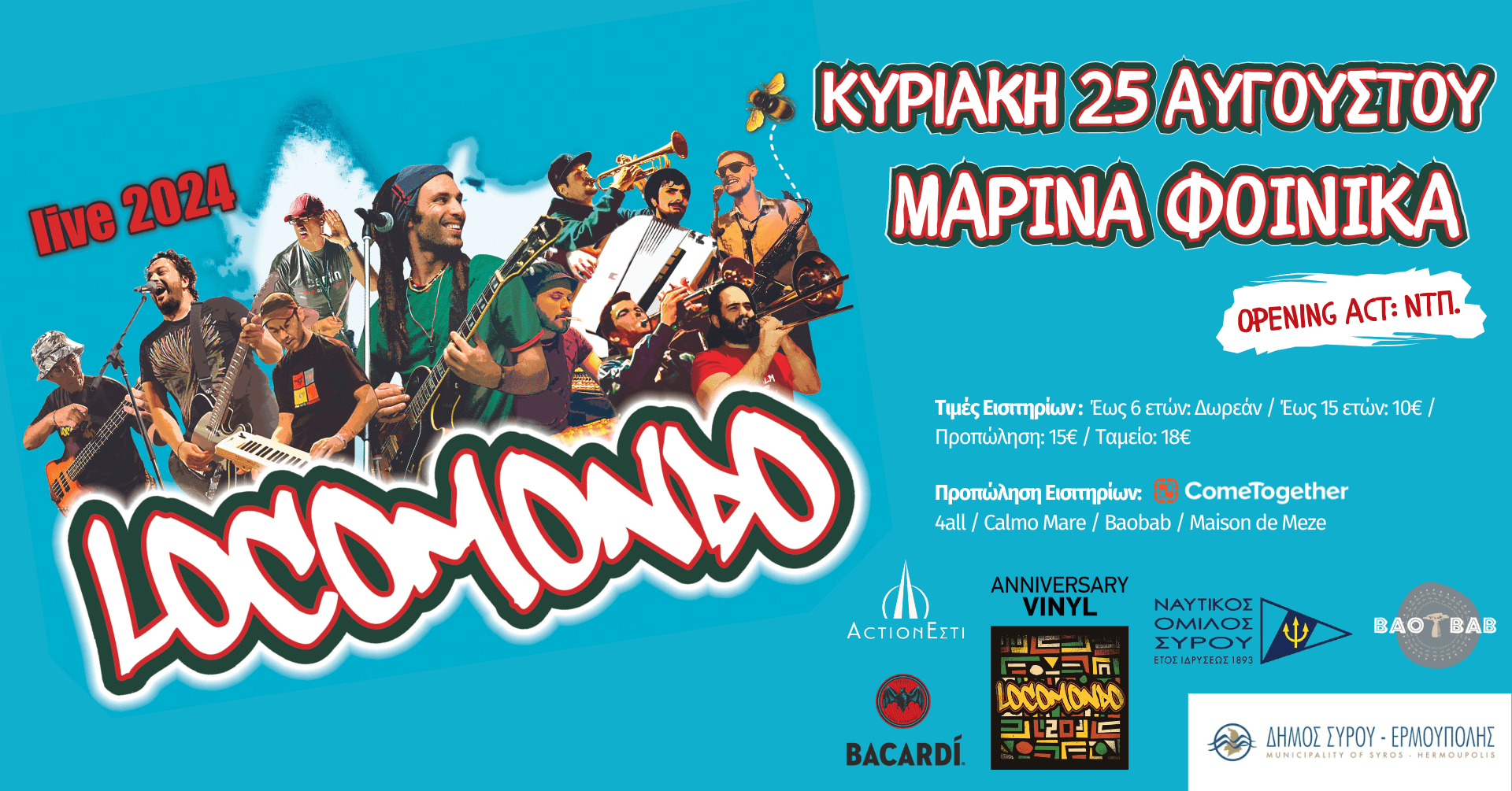 Οι Locomondo, ένα από τα πιο γνωστά, νεανικά και αγαπητά συγκροτήματα στην Ελλάδα, γιορτάζουν το φετινό καλοκαίρι εικοσιένα χρόνια επί σκηνής, εικοσιένα χρόνια μεγάλων συναυλιών! Την Κυριακή 25 Αυγούστου ταξιδεύουν στην Σύρο για να χαρίσουν ένα αξέχαστο συναυλιακό πάρτι σε κατοίκους και επισκέπτες του νησιού. Με μία μίξη από reggae, ska, latin, rock και ελληνικούς παραδοσιακούς ρυθμούς, οι Locomondo θα μας ξεσηκώσουν και θα μας ενώσουν όλους σε μία μεγάλη παρέα ατελείωτου χορού στη Μαρίνα Φοίνικα!