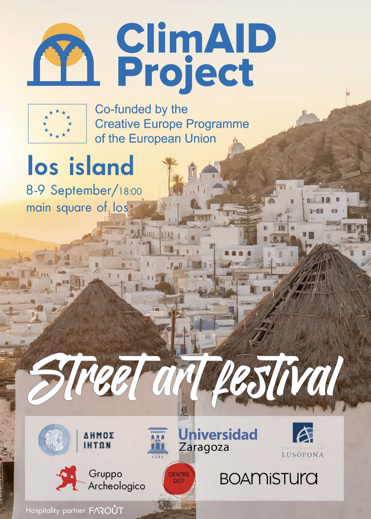 Το καινοτόμο Street Art Festival του Climaid project, θα διεξαχθεί στις 8 και 9 Σεπτεμβρίου στην κεντρική πλατεία της Χώρας Ίου. Επιδοτείται από το ευρωπαϊκό πρόγραμμα Creative Europe με τη συμβολή της Έφης Αναστασοπούλου, συμβούλου ευρωπαϊκών προγραμμάτων και του δημάρχου Ιητών, Γκίκα Γκίγκα, ενώ την καλλιτεχνική επιμέλεια έχει αναλάβει η γνωστή Συριανή ζωγράφος Αγνή Ρούσσου, καθώς θα ζωγραφίσει ζωντανά με τη συμμετοχή των πολιτών και των επισκεπτών σε ένα καινοτόμο καμβά 4x2 μέτρων.