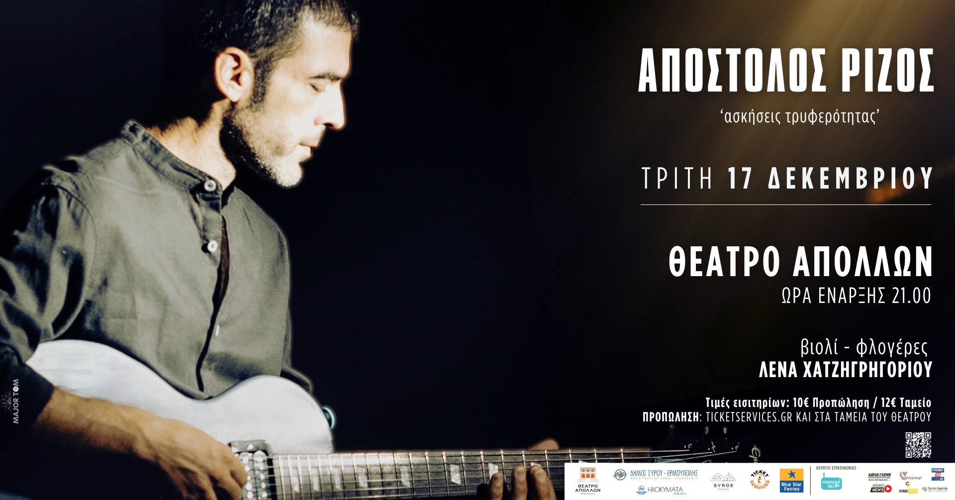 Προπώληση Εισιτηρίων: https://www.ticketservices.gr/event/syros-askiseis-tryferotitas-apostolos-rizos/ & στα ταμεία του θεάτρου