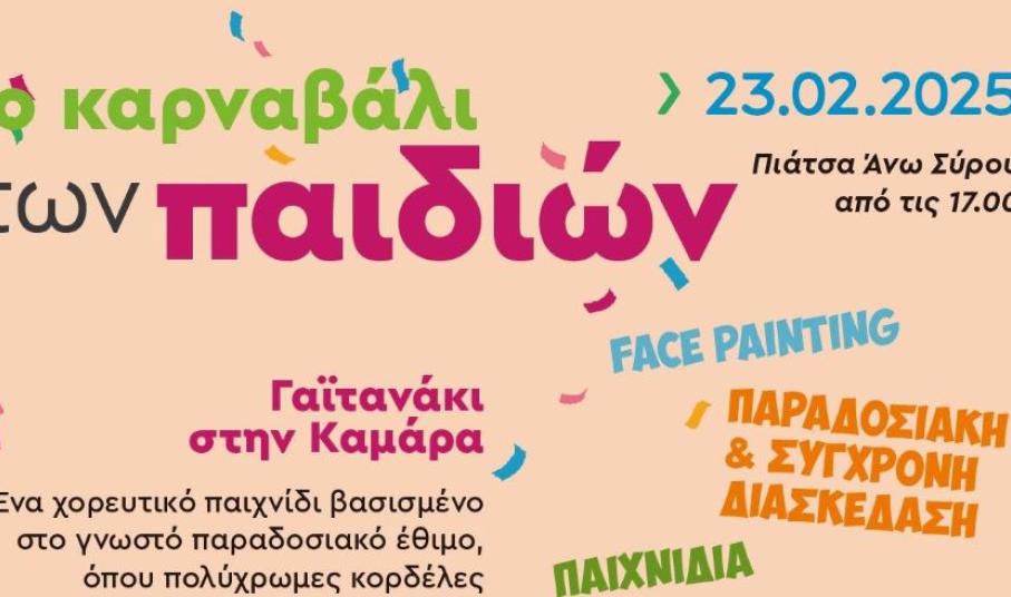 Το 2ο Καρναβάλι των Παιδιών του Δήμου Σύρου - Ερμούπολης επιστρέφει δυναμικά την Κυριακή 23 Φεβρουαρίου από τις 17:00 στην ενοριακή αίθουσα του Αγ. Σεβαστιανού στην Άνω Σύρο, μετά την επιτυχημένη διοργάνωση του 2024.
