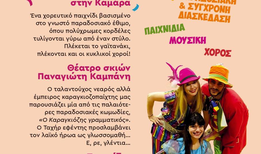 Στη συνέχεια, η παιδαγωγός Νόνη Κιουτσούκη θα ενθαρρύνει το κοινό να συνεχίσει τον χορό στο γαϊτανάκι πριν προχωρήσει προς την Πιάτσα. Επίσης, τα παιδιά θα παρακολουθήσουν Θέατρο Σκιών με τον Παναγιώτη Καμπάνη, τον «Καραγκιόζη γραμματικό», τον αγαπημένο ήρωα του θεάτρου σκιών στην Ελλάδα.