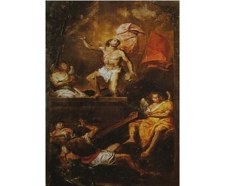 από τον ναό των Αγίων Αναργύρων της Ζακύνθου. Ο Χριστός βγαίνει από τον τάφο κρατώντας το κατακόκκινο λάβαρο της νίκης. Αριστερά ένας άγγελος κάθεται στο χείλος του τάφου, έχει τις παλάμες ενωμένες σε στάση προσευχής και παρακολουθεί τον Κύριο. Κατά δεξιά ένας άλλος άγγελος κρατάει το κάλυμμα της σαρκοφάγου.