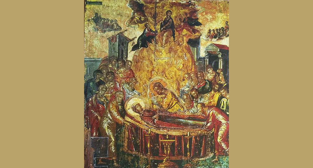 Είναι η δεύτερη χρονολογικά εκκλησία της Ερμούπολης γνωστή και ως “εκκλησία των Ψαριανών (1828), με πλούσιο εσωτερικό διάκοσμο. Την πρωταπριλιά του 1983 ο Βυζαντινολόγος Γ. Μαστορόπουλος έμεινε έκθαμβος όταν ανακάλυψε ότι η εικόνα της Κοιμήσεως της Θεοτόκου είχε την υπογραφή ...” ΔΟΜΗΝΙΚΟΣ ΘΕΟΤΟΚΟΠΟΥΛΟΣ Ο ΔΕΙΞΑΣ” (15ος αιώνας). Η εικόνα έχει ταξιδέψει και στην Ελλάδα και στο εξωτερικό, όπου έχουν γίνει σημαντικές εκθέσεις. Πλούσιος είναι στο εξωτερικό ο ζωγραφικός διάκοσμος σε μορφές αγίων και ανθέμια, σταυρούς και αστέρια. Στο ιερό ωραίες νεώτερες τοιχογραφίες, έργα του αγιογράφου Ν. Χρήστου, 1976.