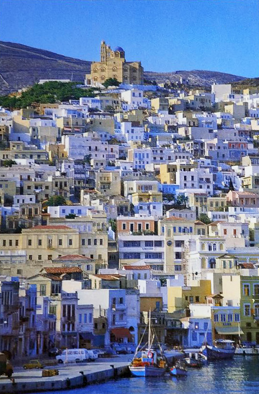 Όταν το πλοίο μπαίνει στο λιμάνι της Σύρου, το θέαμα μιας πόλης που σκαρφαλώνει σε δύο λόφους εντυπωσιάζει και συναρπάζει τον επισκέπτη. Όπως και να το κάνουμε δεν είναι μία, αλλά δύο πόλεις. Δύο πόλεις, δύο κοινωνίες που έχτισαν σε μια κλίμακα με την πιο δυνατή αμφιθεατρικότητα. Δύο λόφοι και δύο κόσμοι.