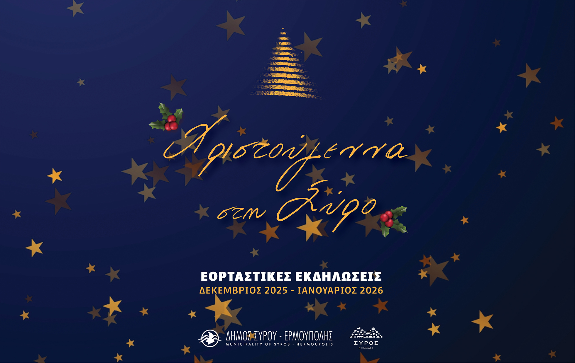 Ο Δήμος Σύρου - Ερμούπολης με μεγάλη χαρά ανακοινώνει την έναρξη των Χριστουγεννιάτικων εκδηλώσεων, προσκαλώντας όλους, μικρούς και μεγάλους, να ζήσουν τη μαγεία της πιο όμορφης γιορτής του χρόνου!