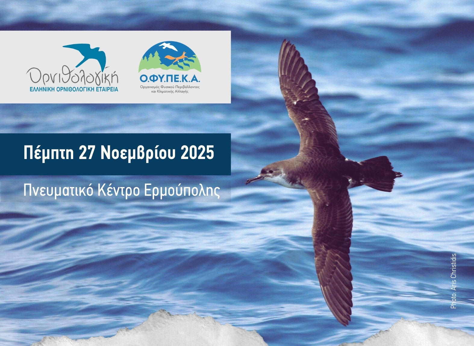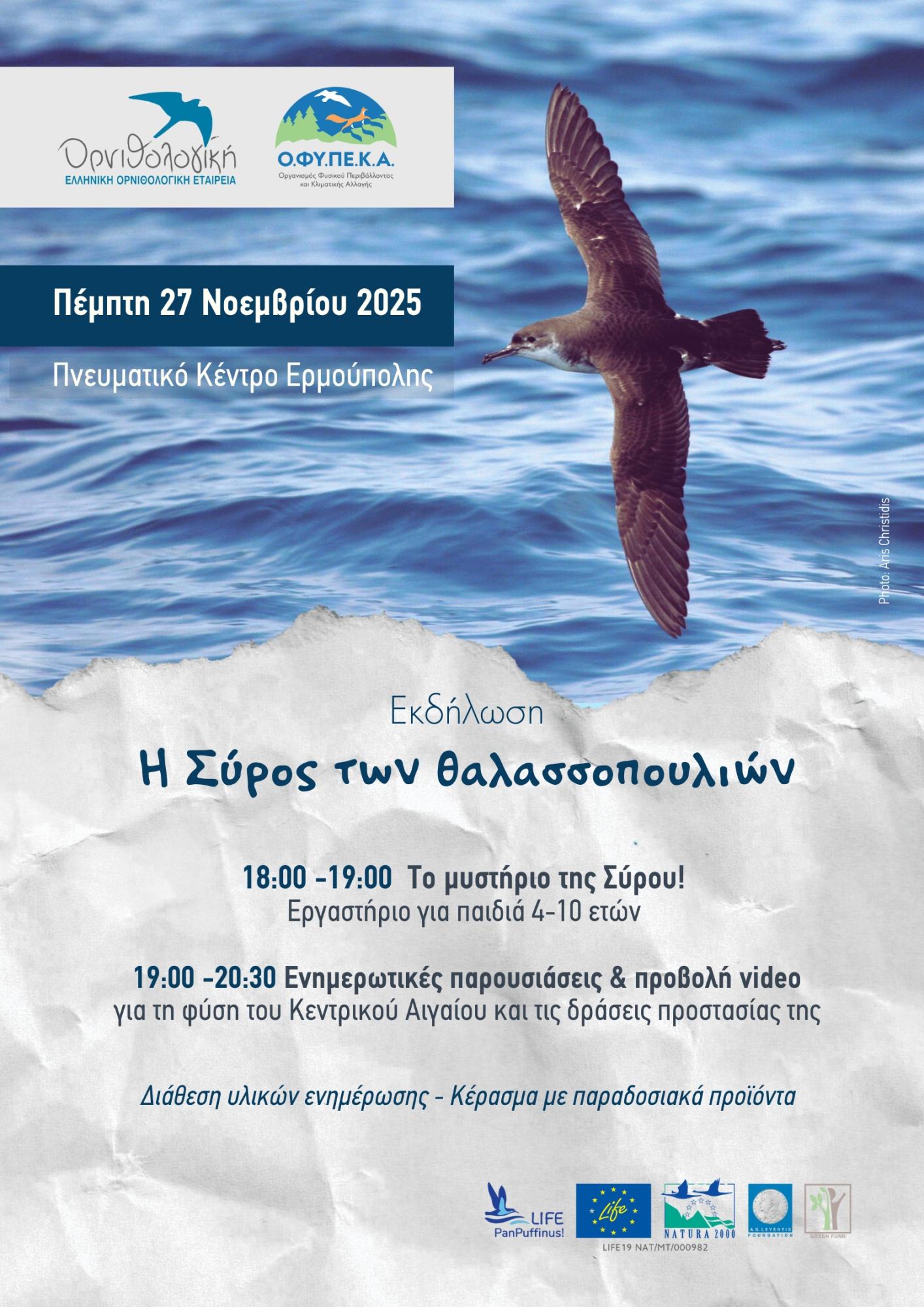Η Ελληνική ΟΡΝΙΘΟΛΟΓΙΚΗ Εταιρεία και η Μονάδα Διαχείρισης Προστατευόμενων Περιοχών Κεντρικού Αιγαίου του Ο.ΦΥ.ΠΕ.Κ.Α. προσκαλούν το κοινό της Σύρου και κάθε ενδιαφερόμενο/η σε μια ανοιχτή εκδήλωση, για κάθε ηλικία, αφιερωμένη στα θαλασσοπούλια και τη μοναδική φύση του Αιγαίου, το απόγευμα της Πέμπτης 27 Νοεμβρίου 2025, στο Πνευματικό Κέντρο Ερμούπολης (αίθουσα Γ. Ρίτσου).