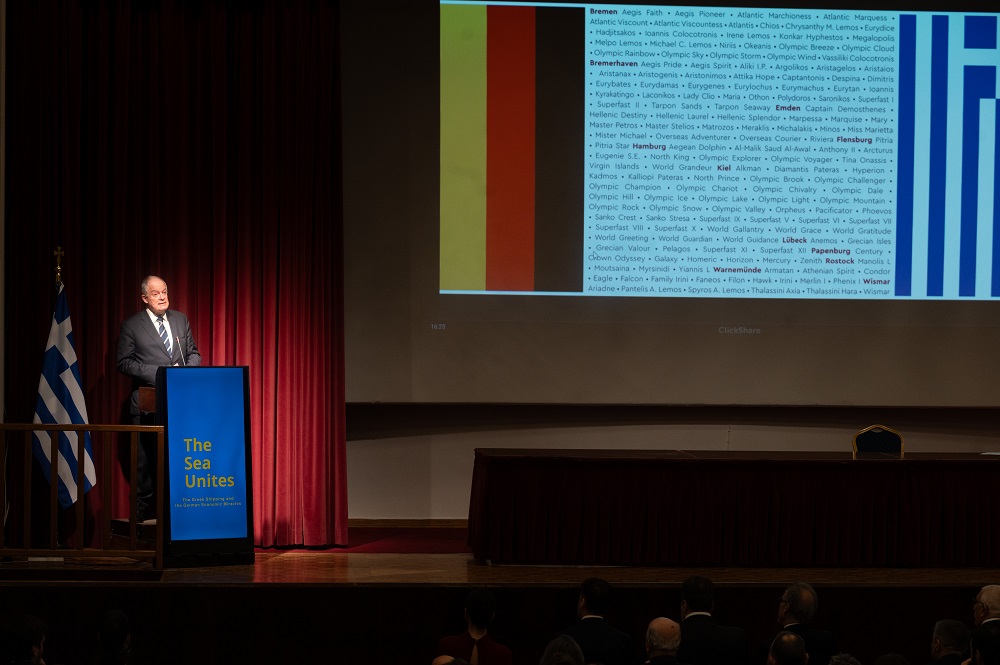 Εστιάζοντας την αναφορά του στη χρονική περίοδο που πραγματεύεται η έκθεση σχετικά με τη δραστηριότητα των Ελλήνων εφοπλιστών, ο ΠτΔ έκανε λόγο για “ένα τεκμηριωμένο και εξαιρετικά διαφωτιστικό έργο του ιστορικού Γιώργου Φουστάνου, καρπός πολυετούς έρευνας, που αναδεικνύει πώς οι παραγγελίες Ελλήνων πλοιοκτητών συνέβαλαν καθοριστικά στην οικονομική ανασυγκρότηση της Δυτικής Γερμανίας και τη σταδιακή επανένταξή της στον παγκόσμιο χάρτη”. Σύμφωνα με όσα επεσήμανε ακολούθως, “η ιστορική αυτή αφήγηση αποκτά ιδιαίτερη βαρύτητα αν αναλογιστούμε το σημείο εκκίνησής της. Κατά τη διάρκεια του Β’ Παγκοσμίου Πολέμου, οι Έλληνες χάσαμε τα τρία τέταρτα του εμπορικού μας στόλου από τα πυρά, κυρίως, των γερμανικών υποβρυχίων και για τέσσερα χρόνια η χώρα μας υποδουλώθηκε στις δυνάμεις του Άξονα. Παρά ταύτα, αναπτύξαμε μετά τον πόλεμο επιχειρηματικές σχέσεις με τα καθημαγμένα, αρχικά, ναυπηγεία της Δυτικής Γερμανίας”.