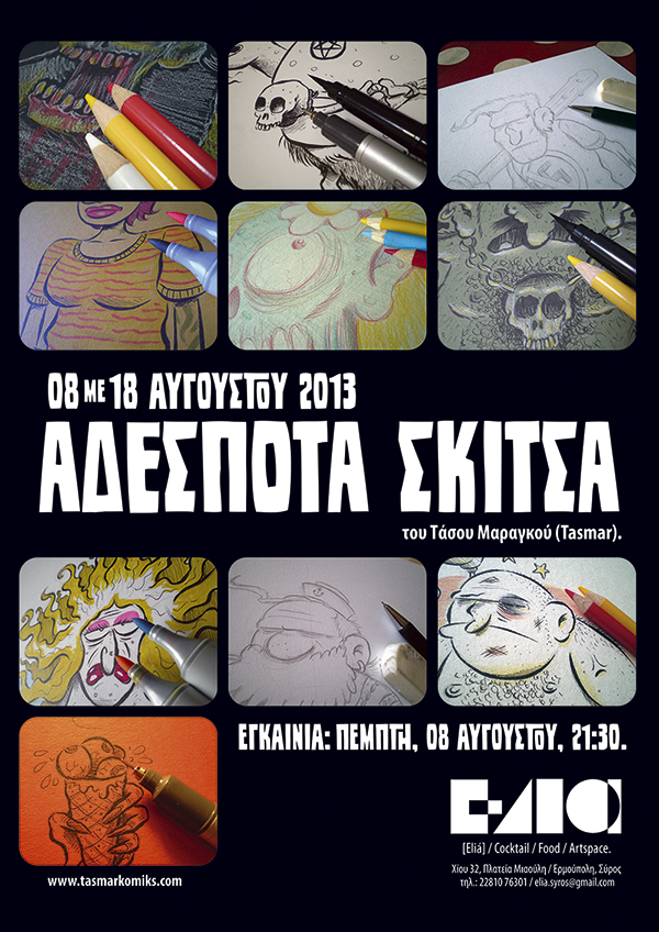 Πρωτότυπες σελίδες από διάφορες εικονογραφήσεις που έχουν ήδη δημοσιευθεί, αλλά και πολλές νέες δημιουργίες περιλαμβάνονται στην έκθεση του Συριανού καλλιτέχνη Τάσου Μαραγκού ή αλλιώς Tasmar (Krak komiks, Όλα είναι Κόμικξς), με τίτλο “Αδέσποτα Σκίτσα”, που πραγματοποιείται στο χώρο τέχνης Elia στην Ερμούπολη.