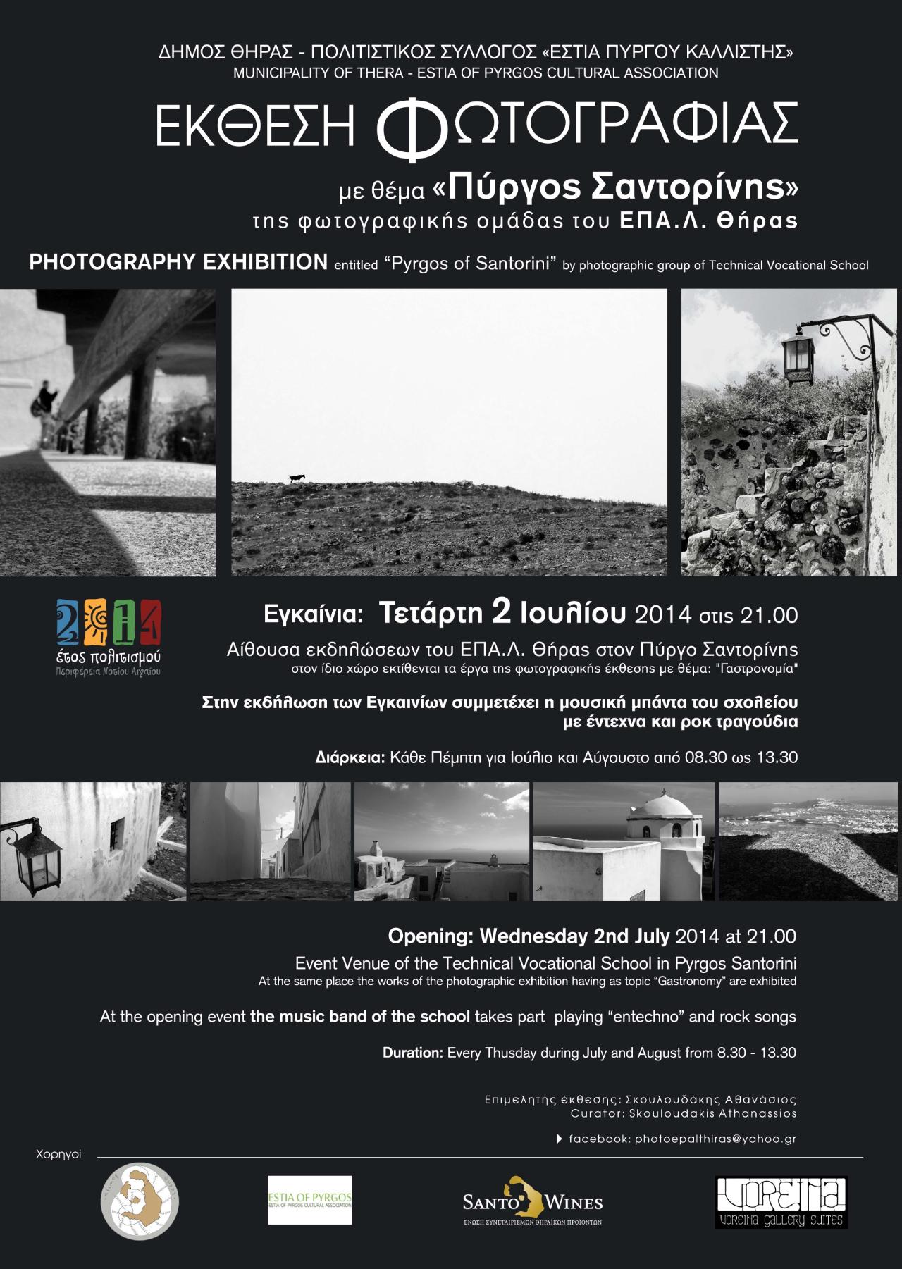 Την έκθεση διοργανώνει ο Δήμος Θήρας και ο Πολιτιστικός Σύλλογος “Εστία Πύργου Καλλίστης” στο πλαίσιο της πρωτοβουλίας “2014 Έτος Πολιτισμού” της Περιφέρειας Νοτίου Αιγαίου.