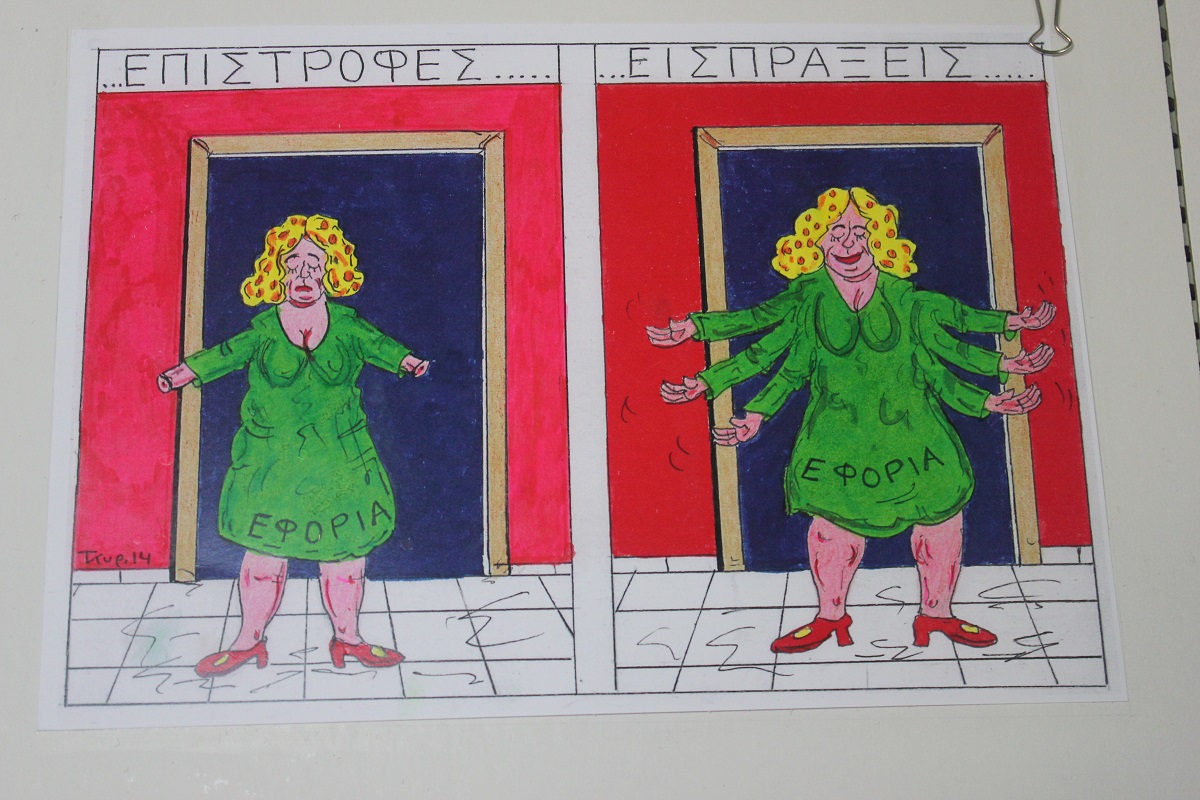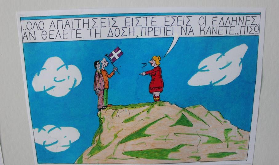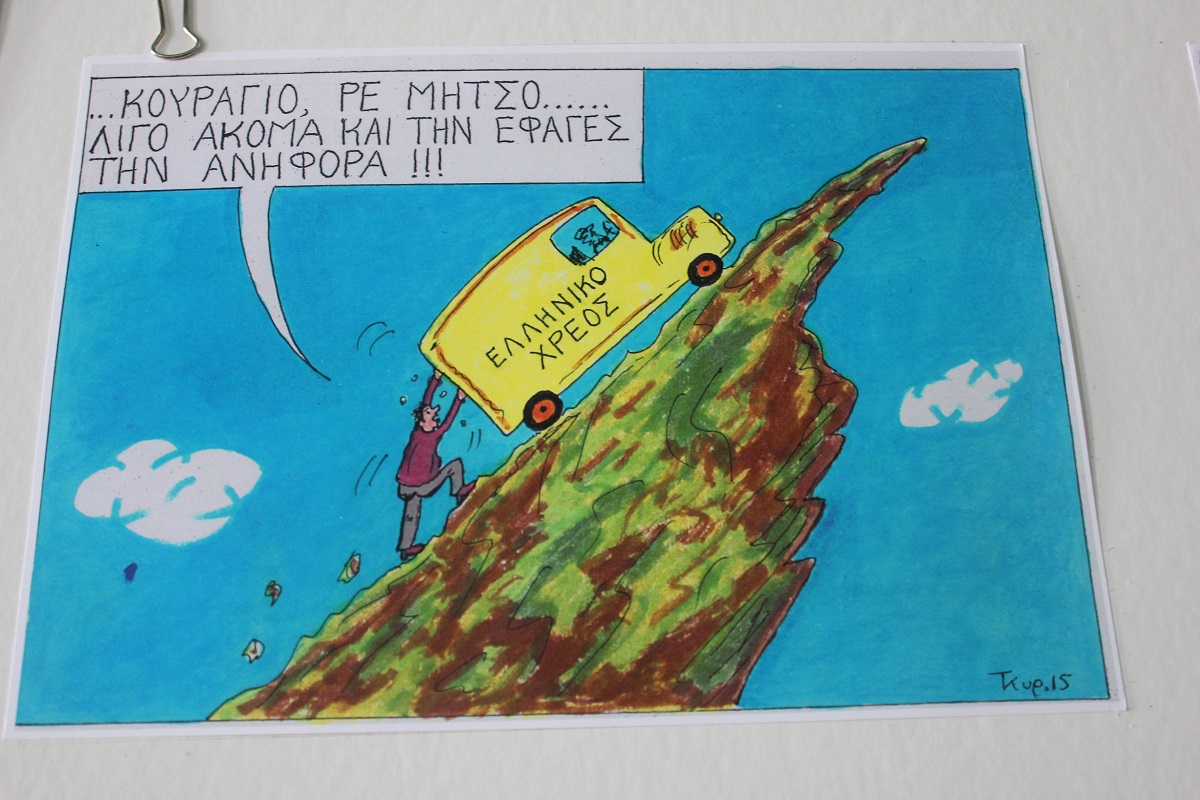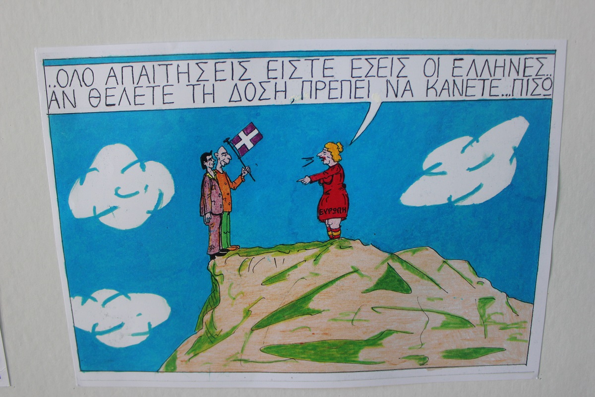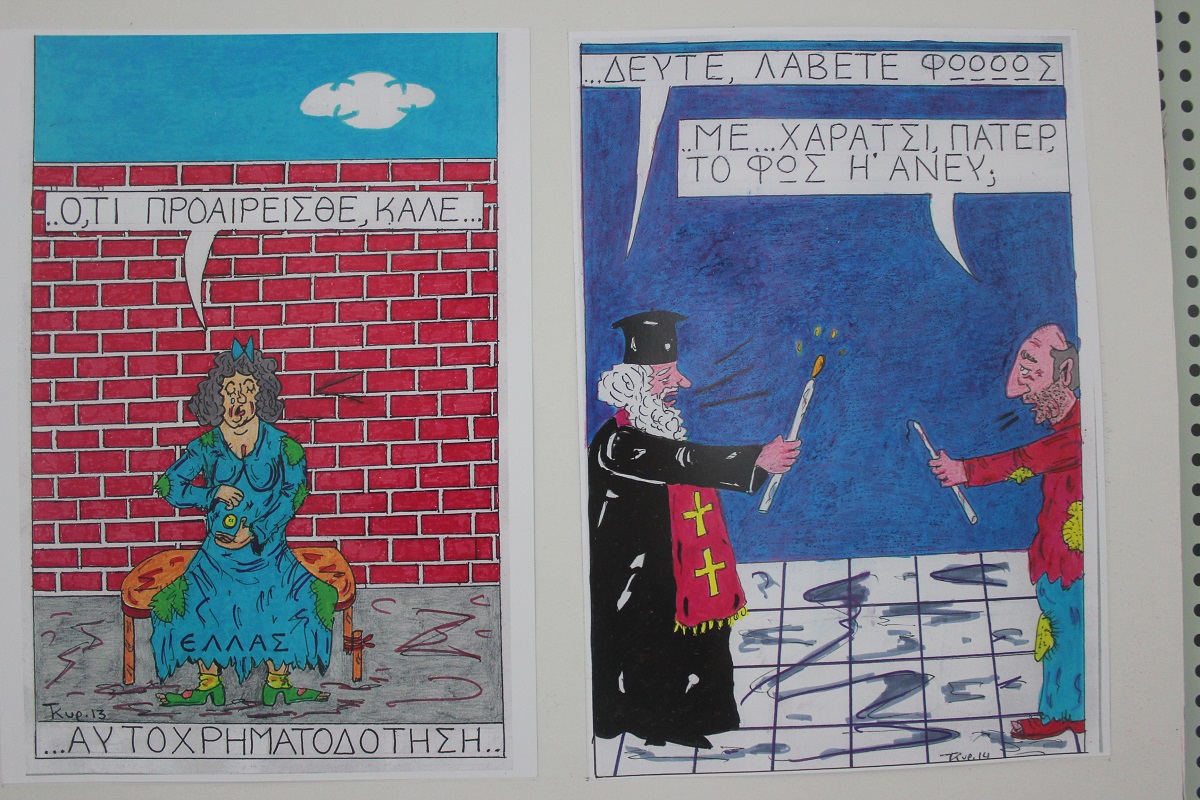 Επίκαιρα σκίτσα, εμπνευσμένα από την πολιτική επικαιρότητα και τις κοινωνικές επιπτώσεις λανθασμένων επιλογών, που απειλούν να υποθηκεύσουν το μέλλον της νέας γενιάς της χώρας μας, έχουν την ευκαιρία να απολαύσουν τόσο οι κάτοικοι, όσο και οι επισκέπτες της Σύρου έως το τέλος Ιουλίου.