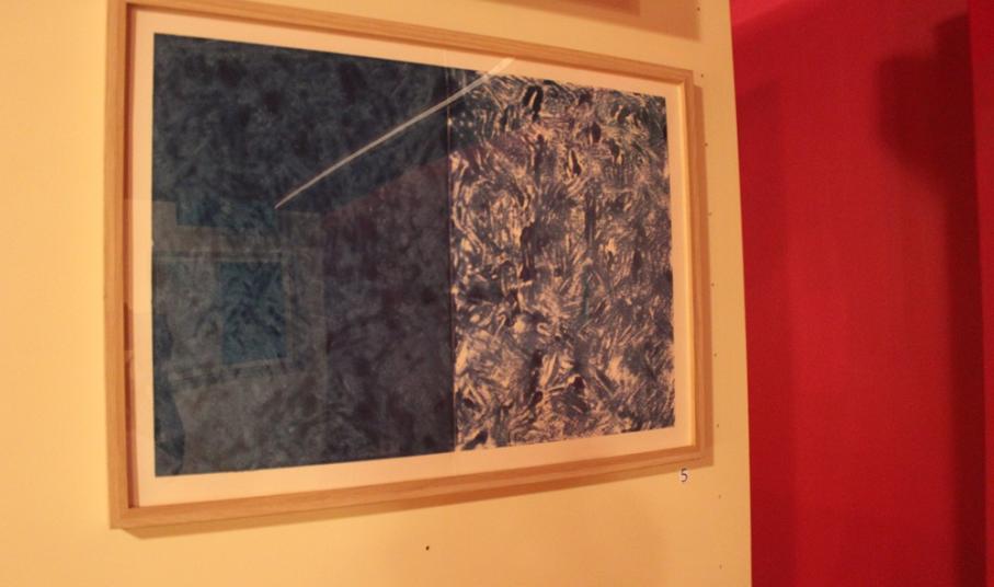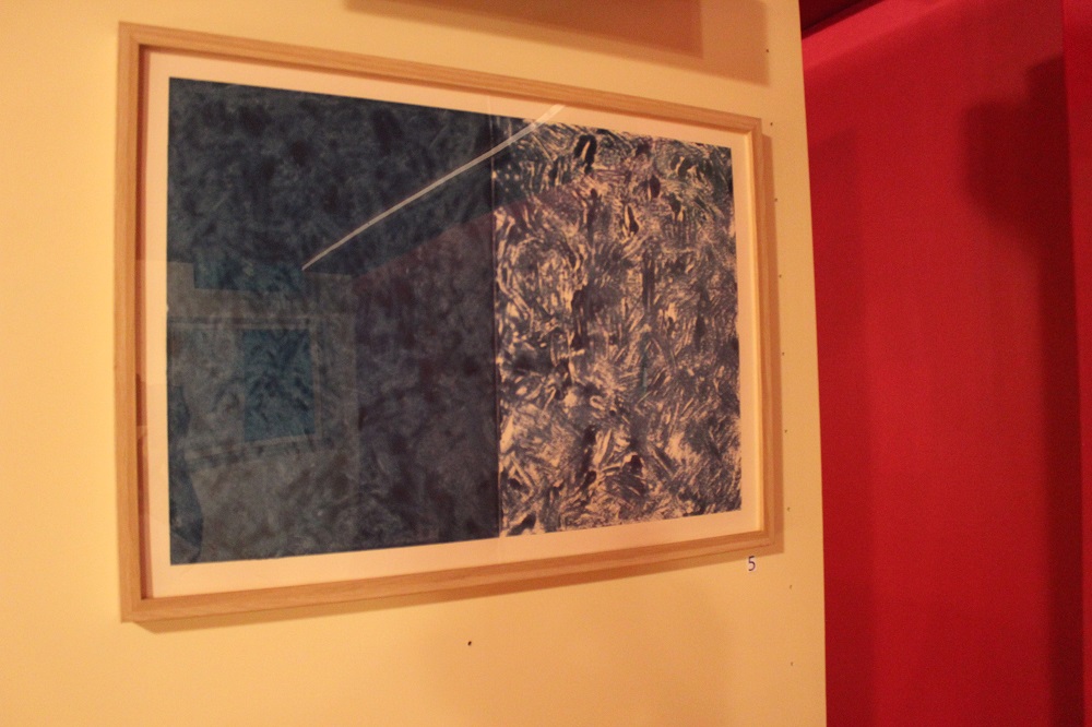 Δεκατέσσερις μπλε πίνακες ζωγραφικής (50 cm x 70 cm) σε άσπρο χαρτί εκτίθενται στα υπάρχοντα σταντ του τρίτου ορόφου.