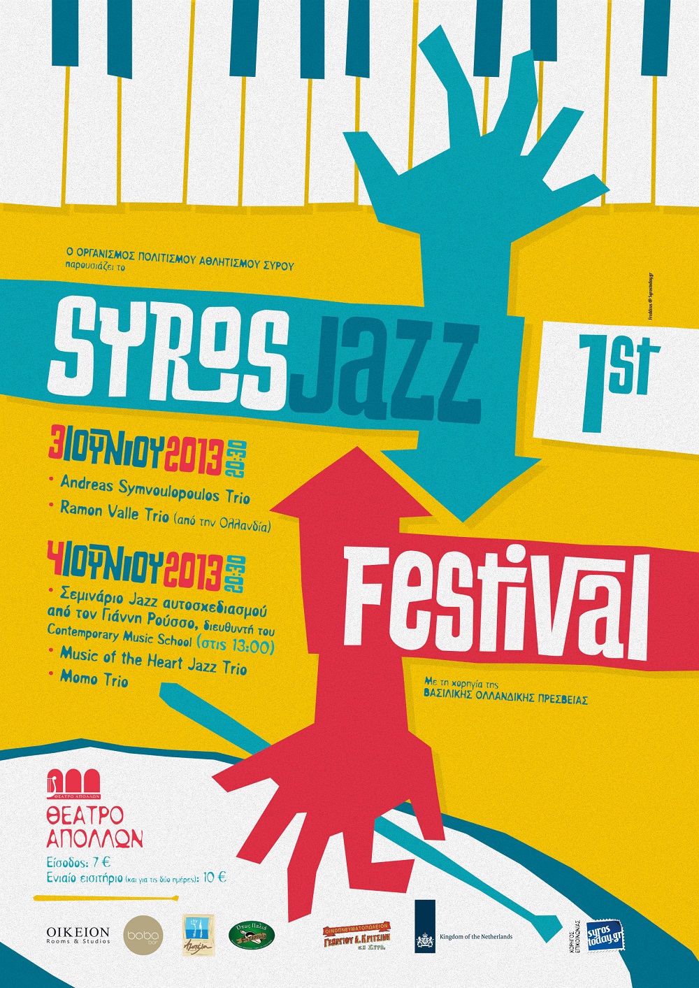 Το φεστιβάλ ανοίγει σήμερα στις 8 και μισή το βράδυ με τον πιανίστα Ανδρέα Συμβουλόπουλο και το τρίο του που αποτελείται από τον μπασίστα Άγγελο Παπαδάτο και τον ντράμερ Γιάννη Ρούσσο που γεννήθηκε και μεγάλωσε στη Σύρο. Οι τρεις μουσικοί θα παρουσιάσουν συνθέσεις του πιανίστα αλλά και διασκευές, βασισμένες πάνω στη δημιουργική προσέγγιση της μουσικής εμπειρίας τους, σε συνδυασμό με το αυτοσχεδιαστικό παιχνίδι των ήχων κινούμενοι στα έγκατα και στις παρυφές της τζαζ ως σύγχρονης ευρύτερα μουσικής γλώσσας. Η πρώτη ημέρα θα κλείσει ο Ramon Valle και το τρίο του.