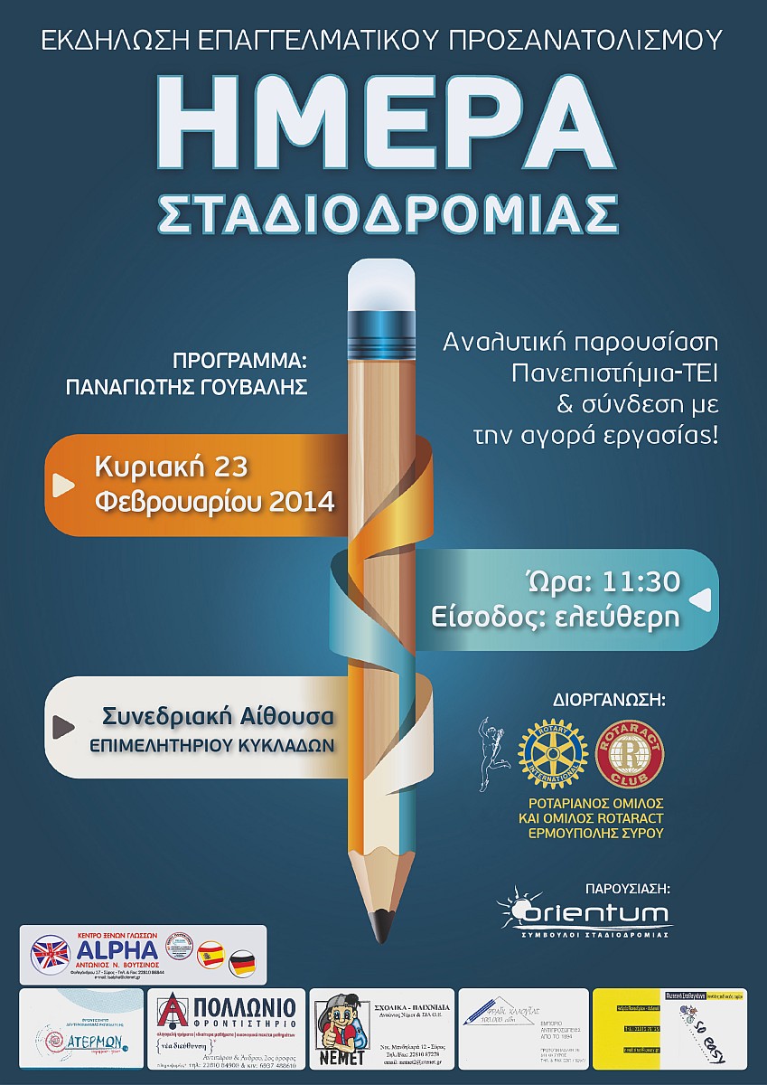 Στο πλαίσιο του προγράμματος "Παναγιώτης Γούβαλης" ο Ροταριανός Όμιλος Ερμούπολης Σύρου και ο Όμιλος Ροταράκτ διοργανώνουν την "Ημέρα Σταδιοδρομίας και Επαγγελματικού Προσανατολισμού για τους μαθητές Λυκείου".