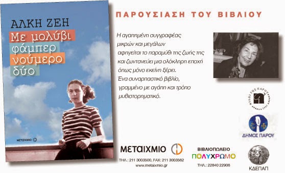 Ο Σύλλογος των Φίλων της Πάρου με την υποστήριξη της ΚΔΕΠΑΠ, το βιβλιοπωλείο Πολύχρωμο και οι εκδόσεις Μεταίχμιο, προσκαλούν το κοινό στην παρουσίαση του νέου βιβλίου της Άλκης Ζέη “Με μολύβι φάμπερ νούμερο δύο”.