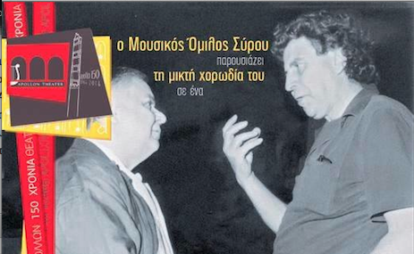 Στο πλαίσιο του αφιερώματος στους δύο μεγάλος σύγχρονους δημιουργούς Μάνο Χατζηδάκη και Μίκη Θεοδωράκη ο μουσικός όμιλος Σύρου και η μικτή χορωδία του παρουσιάζει ένα χορωδιακό αφιέρωμα την Παρασκευή 22 και Σάββατο 23 Αυγούστους στις 21:00. Η παράσταση θα πραγματοποιηθεί στο θέατρο ''Απόλλων'' ενώ τη χορωδία θα συνοδεύσει ολιγομελής ορχήστρα με τη φιλική συμμετοχή του Μανώλη Μητσιά. Σημειώνεται ότι θα υπάρξει ολιγόλεπτη αφήγηση σχετική με τη ζωή και το έργο των δύο συνθετών.