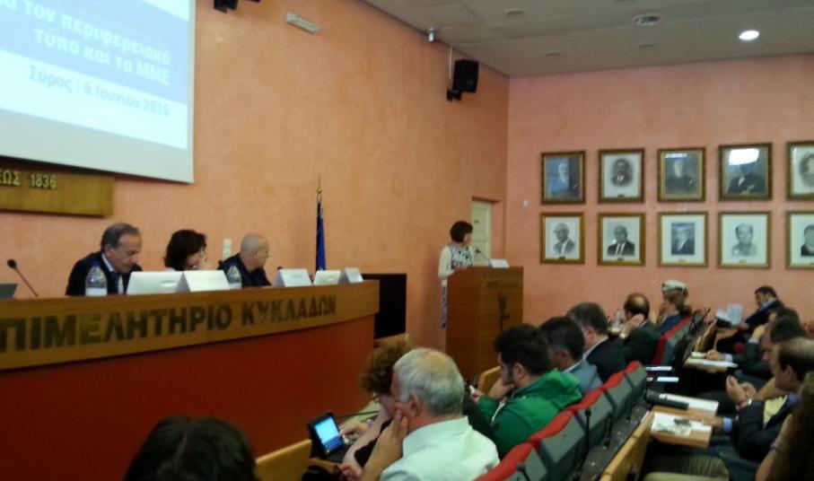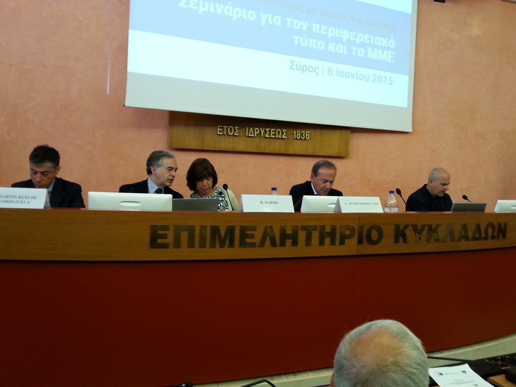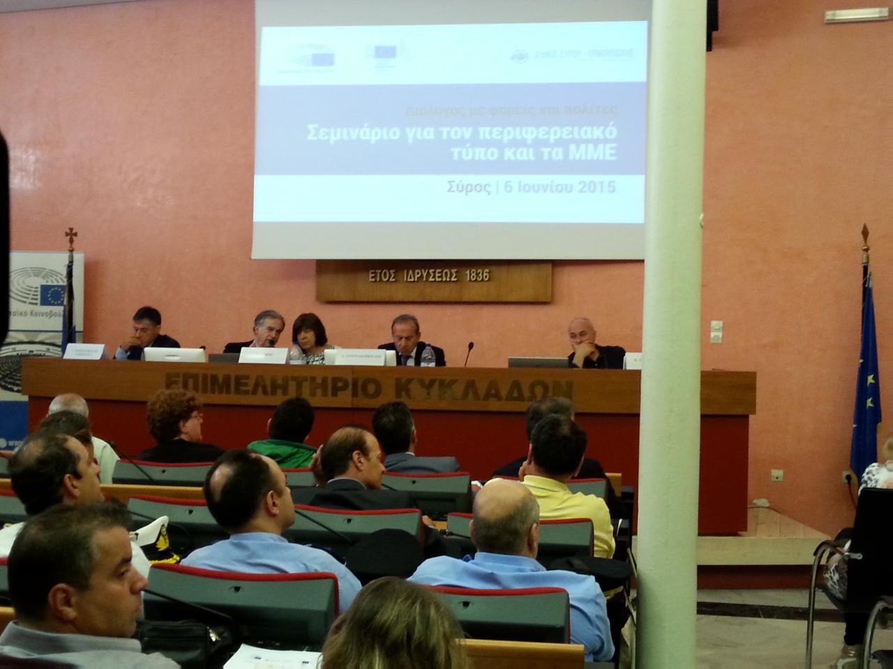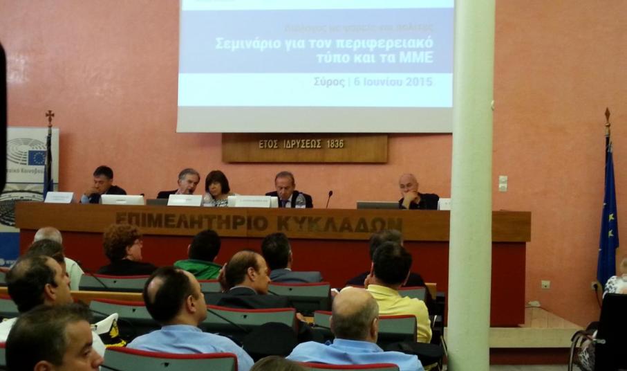 Ημερίδα για τον Περιφερειακό Τύπο και τα ΜΜΕ της Περιφέρειας Ν. Αιγαίου πραγματοποίησε στη Σύρο η Αντιπροσωπεία της Ευρωπαϊκής Επιτροπής και το Γραφείο του Ευρωπαϊκού Κοινοβουλίου στην Ελλάδα, με την υποστήριξη του Επιμελητηρίου Κυκλάδων και του Δήμου Σύρου – Ερμούπολης, το Σάββατο, 6 Ιουνίου.