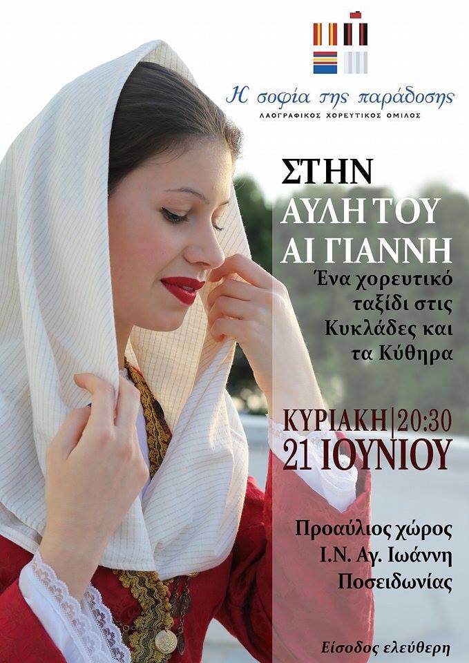 Με ένα χορευτικό ταξίδι στις Κυκλάδες και τα Κύθηρα υποδέχεται το φετινό καλοκαίρι στην αυλή του Αϊ-Γιάννη στην Ποσειδωνία ο Λαογραφικός Χορευτικός Όμιλος “η σοφία της παράδοσης”.