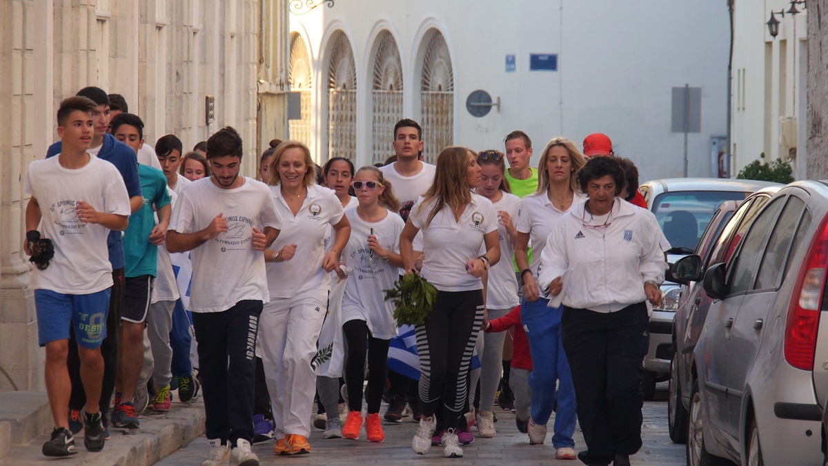 Στην ιστορία του θεσμού αναφέρθηκε στον σύντομο χαιρετισμό της η εμπνεύστρια του «Δρόμου Ειρήνης» Σκεύη Λακαταμίτου, Καθηγήτρια Φυσικής Αγωγής στο 1ο Γυμνάσιο Σύρου. «Η επιταγή της ψυχής μας, μας έφερε και φέτος για 21η συνεχή χρονιά στο ιστορικό ραντεβού μνήμης. Ένα ραντεβού των μικρών μαθητών με την πρόσφατη ιστορία, κάνοντας πράξη και βιωματική εμπειρία την απόδοση φόρου τιμής στους ήρωες χωρίς τυμπανοκρουσίες». Όπως τόνισε, μαθητές, σπουδαστές και καταξιωμένοι αθλητές οι οποίοι έχουν κάνει υπερήφανη την Ελλάδα σε όλα τα μήκη και τα πλάτη του πλανήτη. «Μαζί και ενωμένοι σήμερα καταθέτουμε στεφάνι στη μνήμη των πρωτεργατών ηρώων της δημοκρατίας και της ειρήνης χώρα μας και παράλληλα, αποδεικνύουμε πόσο μεγάλους άθλους μπορεί να κάνει ο άνθρωπος, όχι μόνο στον αθλητισμό ξεπερνώντας τον εαυτό του, αλλά και στην καθημερινή του ζωή, ιδιαίτερα στις μέρες μας που η ειρήνη δεν αποτελεί πλέον το αυτονόητο ανθρώπινο αγαθό, αλλά την επιτακτική ανάγκη για επιβίωση και πρόοδο για εκατομμύρια συνανθρώπους μας» ανέφερε χαρακτηριστικά. Ωστόσο σημείωσε πως η αθάνατη ελληνική ψυχή έχει αποδείξει ότι και μπορεί και ξέρει να μεγαλουργεί όταν τα γεγονότα το επιτάσσουν. «Οφείλουμε να μεταλαμπαδεύσουμε στις νέες ψυχές των παιδιών μας αυτές τις μεγαλειώδεις ανθρώπινες ιστορικές μνήμες και να τους μάθουμε ότι το «διαίρει και βασίλευε» μόνο κακό μας κάνει. Ότι το προσωπικό βόλεμα μπορεί να είναι το ξεβόλεμα του διπλανού. Το μίσος και ο φανατισμός φέρνουν διχόνοια. Ότι όταν μοιράζεσαι τη χαρά, αυτή διπλασιάζεται και όταν μοιράζεις τη δυστυχία, αυτή γίνεται μισή. Ως λαμπαδηφόροι της ειρήνης, αυτοί οι μικροί σήμερα μαθητές αύριο θα μεγαλουργήσουν και θα λάμψουν όπως το υπέρλαμπρο ελληνικό φως του Αιγαίου. Του Αιγαίου που η θάλασσά του μας ενώνει και δεν θα πρέπει να μας χωρίζει, που είναι σήμερα δυστυχώς ο μεγαλύτερος υγρός τάφος στην Ελλάδα», κατέληξε.
