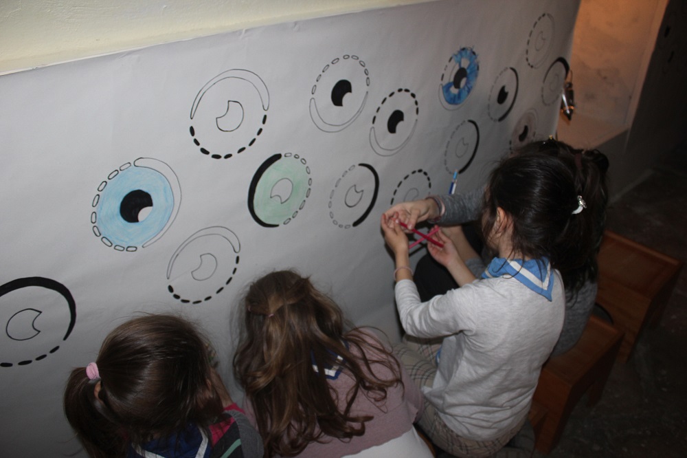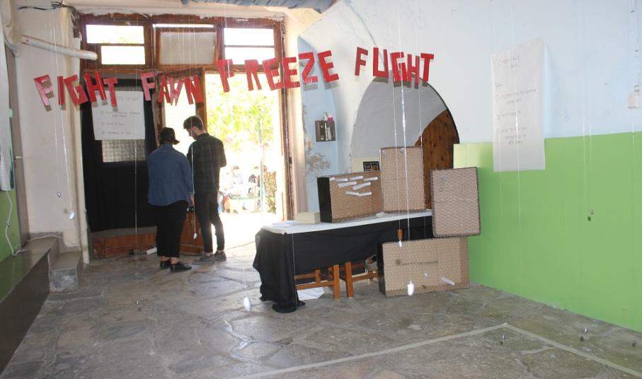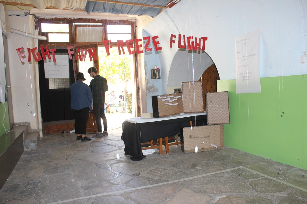 Πρώτη δράση του χθεσινού pre-event ήταν το «Ήμουν κι εγώ εδώ». Οι συμμετέχοντες πήραν χρώμα, ακούμπησαν το χέρι τους στο χαρτί και άφησαν το αποτύπωμά τους. Δοκιμάζοντας την οπτική τους, διάλεξαν ένα από τα σχεδιασμένα «μάτια», το χρωμάτισαν και αποτύπωσαν μία έντονη στιγμή. Στη συνέχεια, ανακάλυψαν πώς πλαισιώνεται στα τέσσερα “f” η στιγμή τους. Το κοινό περπάτησε ανάμεσα σε κρεμασμένα βαρίδια, προσπαθώντας να μην τα ακουμπήσει και έφτιαξε το δικό του μονοπάτι. Τέλος, σκέφτηκε την πιο έντονη στιγμή του, την αποτύπωσε στο χαρτί και την έριξε στο experience box.