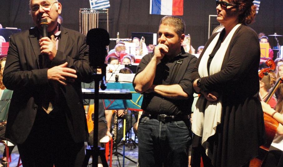 44 τέσσερις μουσικοί μαζί με 82 Γάλλους μουσικούς και και τους μαέστρους τους παρουσίασαν το αποτέλεσμα του εβδομαδιαίου σεμιναρίου ενώπιον 350 θεατών, οι οποίοι κατέκλυσαν το Centre Bergès in Villard-Bonnot. Το κοινό είχε την ευκαιρία να απολαύσει τις συνθέσεις “Magic Overture” (T. Doss), Choreografy (T. Sheldon), African Beat (A. Waignein) και “Άλλος για Χίο τράβηξε” του Δήμου Μούτση. Στο τέλος της παρουσίασης, οι μουσικοί είχαν τη χαρά να υποδεχτούν στη σκηνή την κ. Labarche και να επαναλάβουν μαζί της το τελευταίο κομμάτι, το οποίο καταχειροκροτήθηκε.