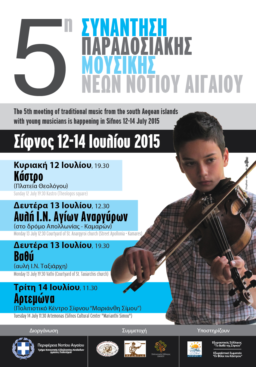 Η Περιφέρεια Νοτίου Αιγαίου διοργανώνει στη Σίφνο (12-14 Ιουλίου 2015) την 5η Μουσική Συνάντηση Παραδοσιακής Μουσικής Νέων Νοτίου Αιγαίου.