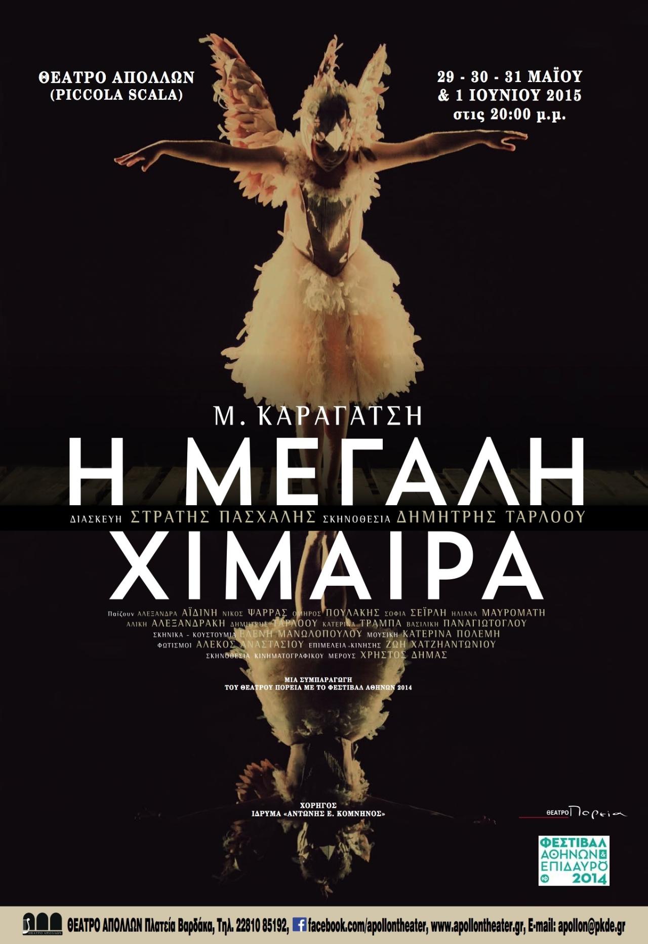 Αύριο, Τετάρτη 13 Μαΐου θα ξεκινήσει στο Θέατρο Απόλλων η προπώληση των εισιτηρίων για τις τρεις παραστάσεις της “Μεγάλης Χίμαιρας” στη Σύρο, στις 30, 31 Μαΐου και 1 Ιουνίου 2015.