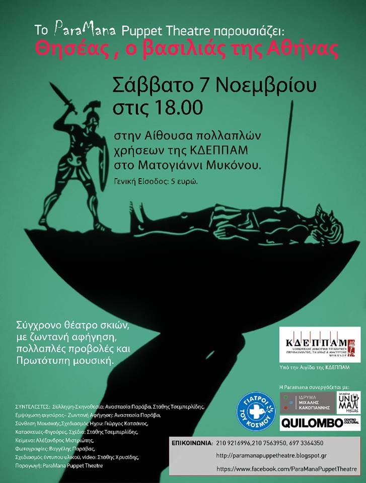 Το Σύγχρονο Πειραματικό Θέατρο Σκιών “ParaMana Puppet Theatre” που συστήθηκε τον Μάιο του 2015 στο κοινό της Σύρου, στο πλαίσιο του διήμερου αφιερώματος στο κουκλοθέατρο και το θέατρο σκιών από τους «Μίμου Άπτου», διευρύνει τον κύκλο γνωριμιών του στις Κυκλάδες, ταξιδεύοντας αυτή τη φορά στη Μύκονο με το έργο «Θησέας, ο βασιλιάς της Αθήνας».