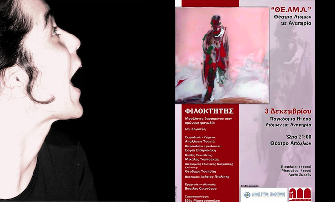 Τιμώντας τη σημερινή Παγκόσμια Ημέρα Ατόμων με Αναπηρία, ο Δήμος Σύρου - Ερμούπολης παρουσιάζει στο ιστορικό θέατρο του νησιού, έναν μονόλογο βασισμένο στην ομώνυμη τραγωδία του Σοφοκλή, από τη μοναδική στην Ελλάδα επαγγελματική θεατρική ομάδα ατόμων με κινητική αναπηρία.