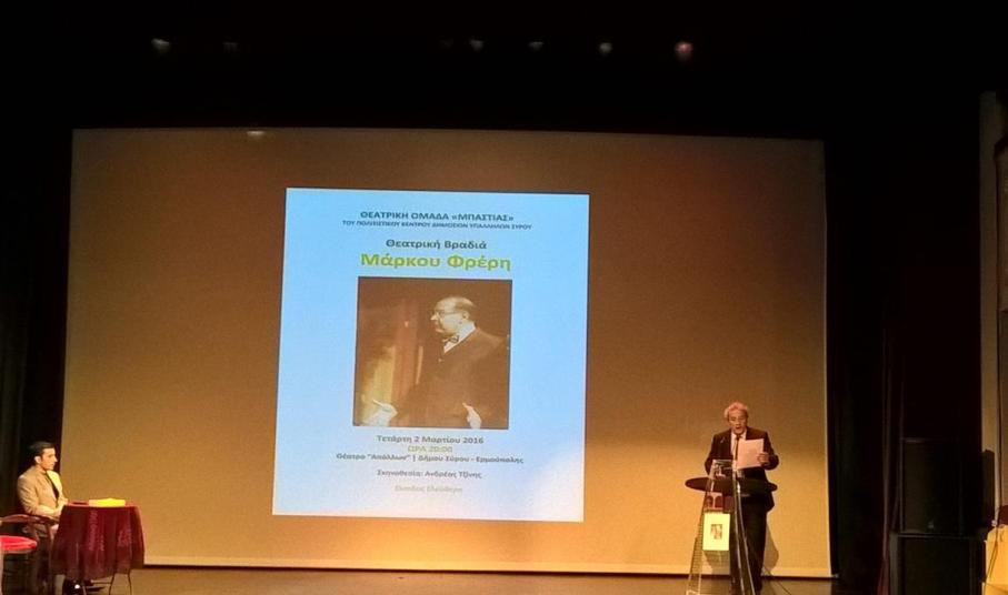 Ένα ακόμη αξιόλογο αφιέρωμα στη ζωή, το έργο και την πολυσχιδή προσφορά του αείμνηστου Μάρκου Φρέρη στην πολιτιστική ζωή του νησιού, παρουσίασε στο Θέατρο Απόλλων η Θεατρική Ομάδα «Μπαστιάς» του Πολιτιστικού Κέντρου Δημοσίων Υπαλλήλων Σύρου.