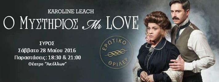 Στα δίχτυα του “Μυστήριου Mr. Love” θα πέσει το επόμενο Σάββατο το θεατρόφιλο κοινό της Σύρου, το οποίο υποδέχεται στο Θέατρο «Απόλλων» το ομώνυμο ερωτικό θρίλερ της Καρολάιν Λιτς με πρωταγωνιστές τον Αλέξανδρο Μπουρδούμη και τη Τζένη Διαγούπη.