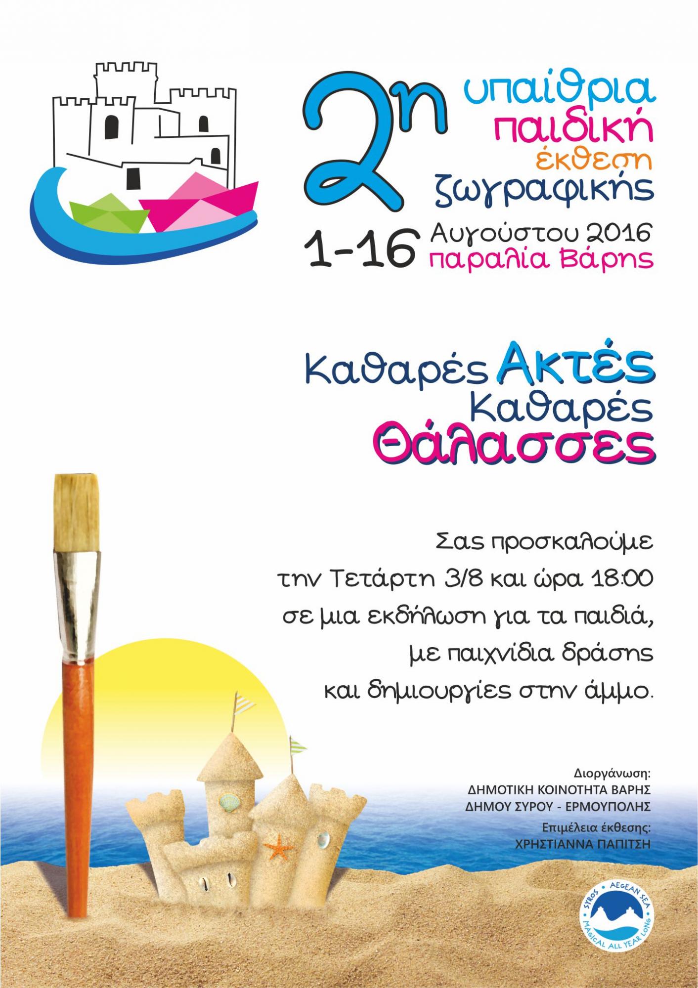 Στο πλαίσιο των πολιτιστικών εκδηλώσεων του Δήμου Σύρου – Ερμούπολης «Σύρος – Πολιτισμός 2016», η Δημοτική Κοινότητα Βάρης διοργανώνει τη 2η Υπαίθρια Παιδική Έκθεση Ζωγραφικής με θέμα «Καθαρές Ακτές Καθαρές Θάλασσες» και σας προσκαλεί την Τετάρτη 3 Αυγούστου και ώρα 18:00, στην παραλία της Βάρης, στην εκδήλωση «Δημιουργώντας στην άμμο», αφιερωμένη στα παιδιά, με παιχνίδια δράσης και δημιουργίες στην άμμο.