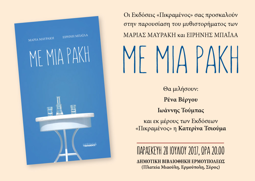 Σας προσκαλούμε στην παρουσίαση του μυθιστορήματος «Με μια ρακή», το οποίο υπογράφουν από κοινού η Μαρία Μαυράκη και η Ειρήνη Μπάιλα και κυκλοφορεί από τις Εκδόσεις «Πικραμένος». Η παρουσίαση θα πραγματοποιηθεί στη Δημοτική Βιβλιοθήκη, την Παρασκευή 28 Ιουλίου 2017 και ώρα 20:00.
