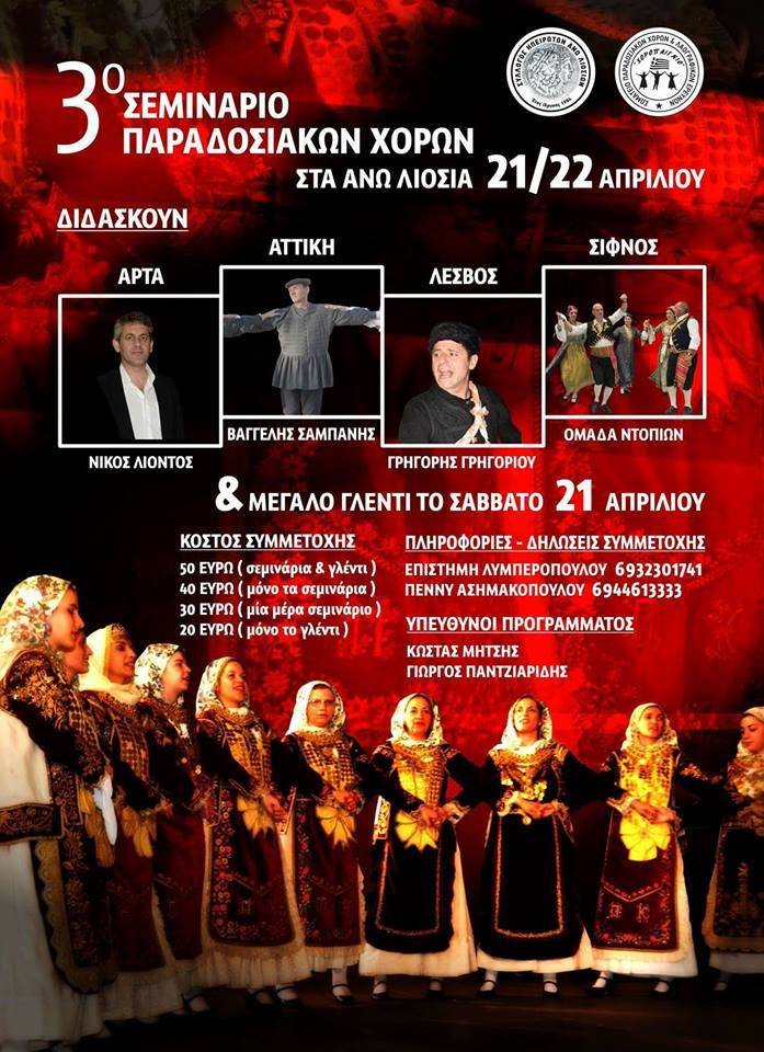Η Σίφνος ...έχει την τιμή να συμμετάσχει για πρώτη φορά με τη μουσική και χορευτική της παράδοση στο 3ο Σεμινάριο Παραδοσιακών Χορών, το οποίο διοργανώνει το Σάββατο 21 και την Κυριακή 22 Απριλίου 2018, στα Άνω Λιόσια, ο Σύλλογος Ηπειρωτών Άνω Λιοσίων & το Σωματείο Παραδοσιακών Χορών και Λαογραφικών Ερευνών "Χοροπαίγνιο".