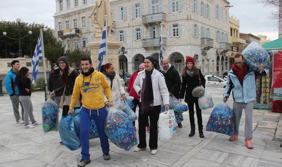 Οι ομάδες, σε μία ακόμη σκυταλοδρομία, κλήθηκαν να γεμίσουν τους σάκους που τους παραδόθηκαν με πλαστικά καπάκια από μπουκάλια, γάλατα, χυμούς, νερά, αναψυκτικά, απορρυπαντικά και άλλα.