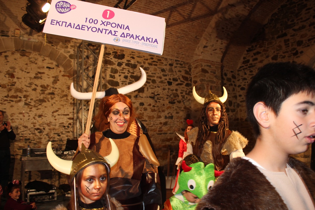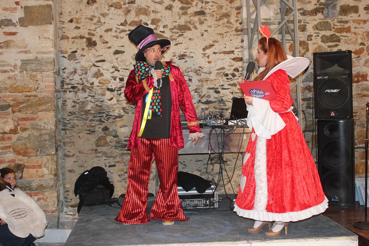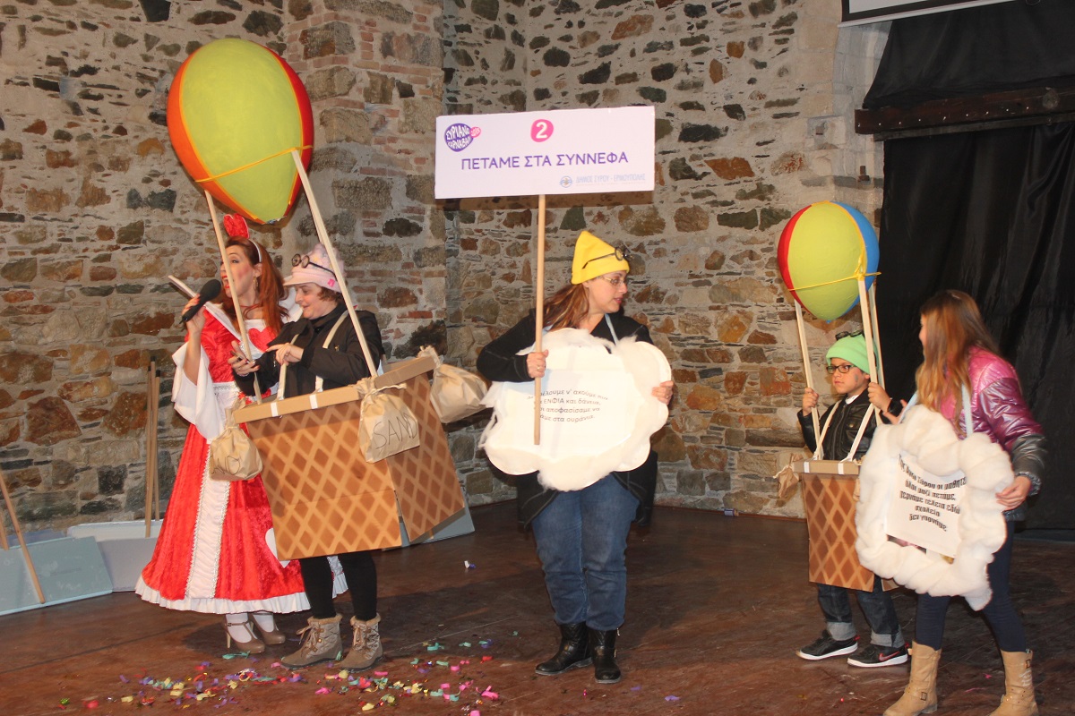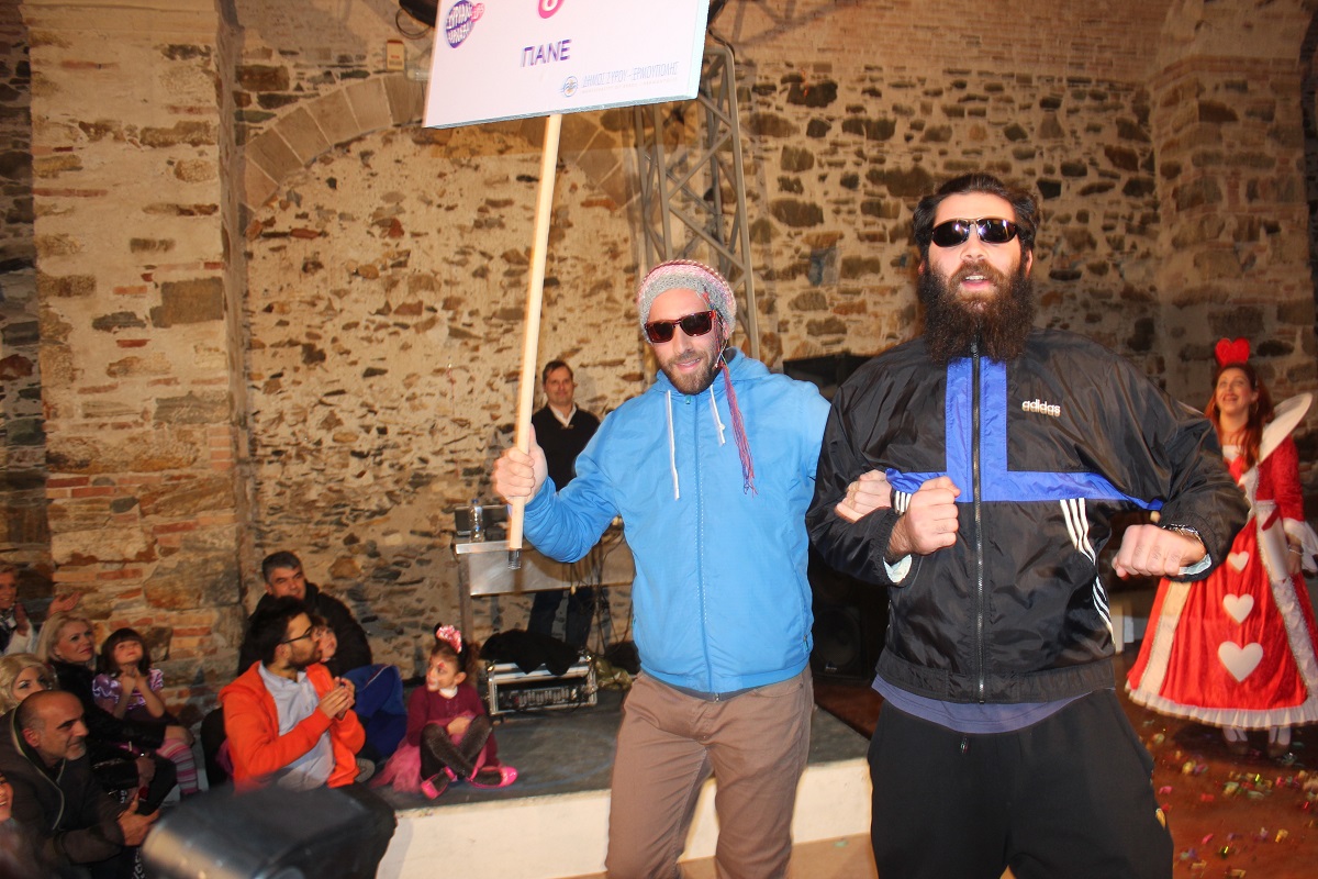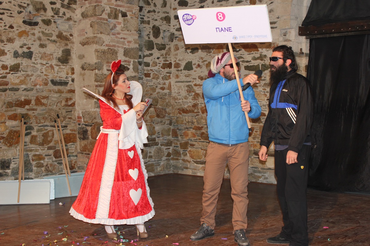 Με τη διάθεση ανεβασμένη στα ύψη, εκπρόσωποι των 18 ομάδων που λαμβάνουν μέρος στις καρναβαλικές παρελάσεις της Άνω Σύρου και της Ερμούπολης συστήθηκαν στο κοινό με τη βοήθεια των παρουσιαστών, Γιώργου Ρούσσου (λέμε και Καπελά) και Μαριάννας Βακονδίου (λέγε με και Κόκκινη Βασίλισσα) οι οποίοι με το κέφι, τον αυθορμητισμό και τις έξυπνες ατάκες τους απογείωσαν τη βραδιά.